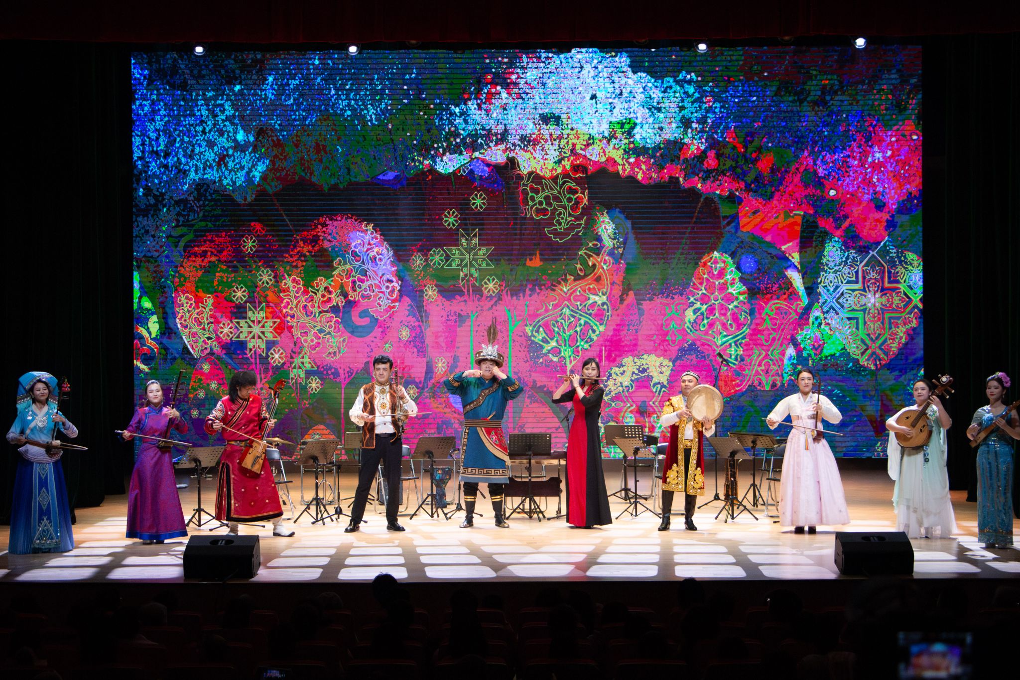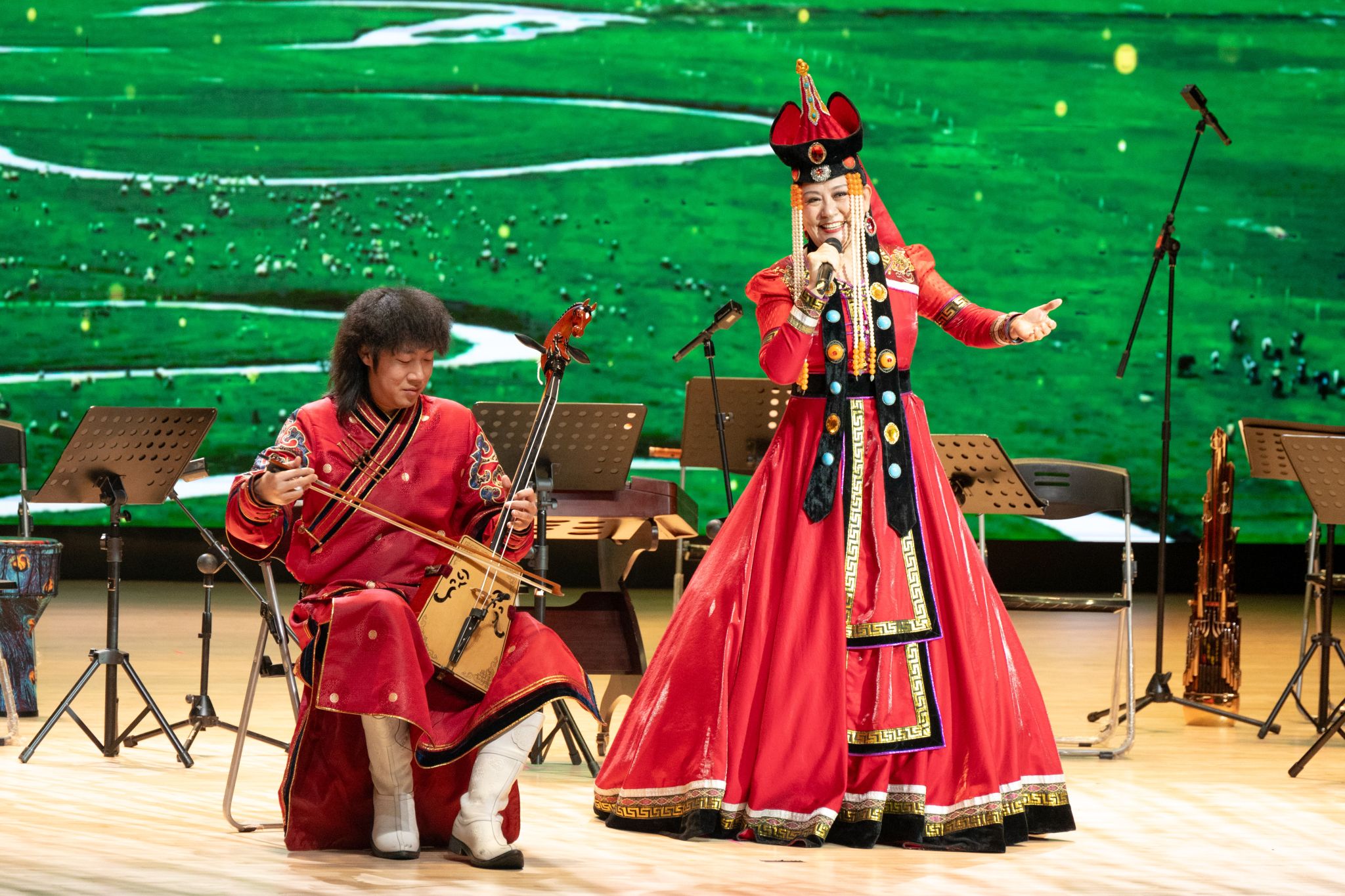 四胡与马头琴的旋律交织,演奏家们合奏乐曲《宴歌》,欢快温馨的曲调带领观众们来到了月夜下的蒙古包,亲友相聚的欢畅场景浮现在眼前。