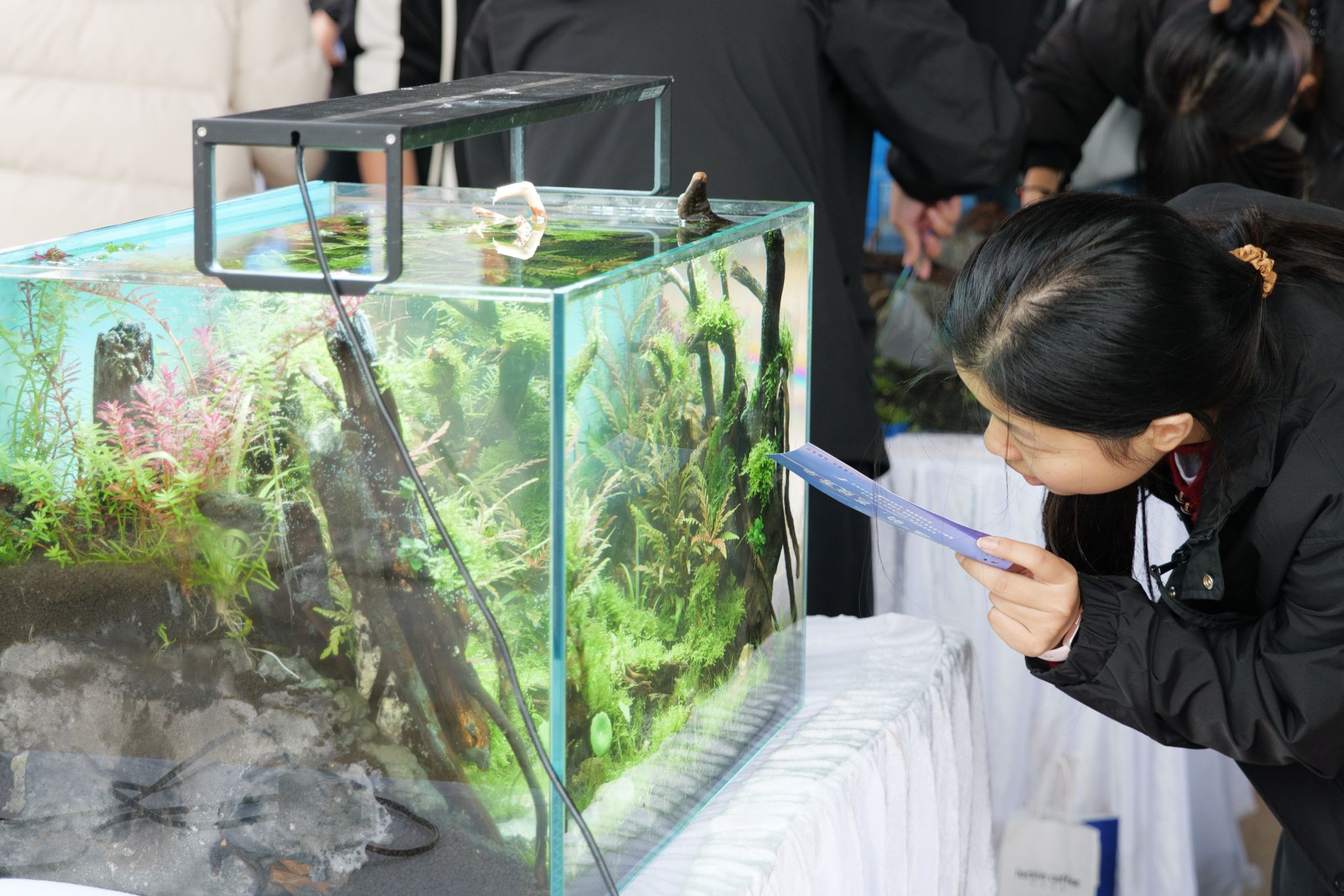 本次水族造景大赛延续“水中江山亦多娇”,以专业技能展呈现水下景致。参赛同学运用水草、沉木、石子等不同材料,设计出风格迥异却精致美观的“小景观”。现场氛围热情洋溢,创意碰撞交织,选手们分工协作,依照自己的思路打造出一个个美丽的水下世界。