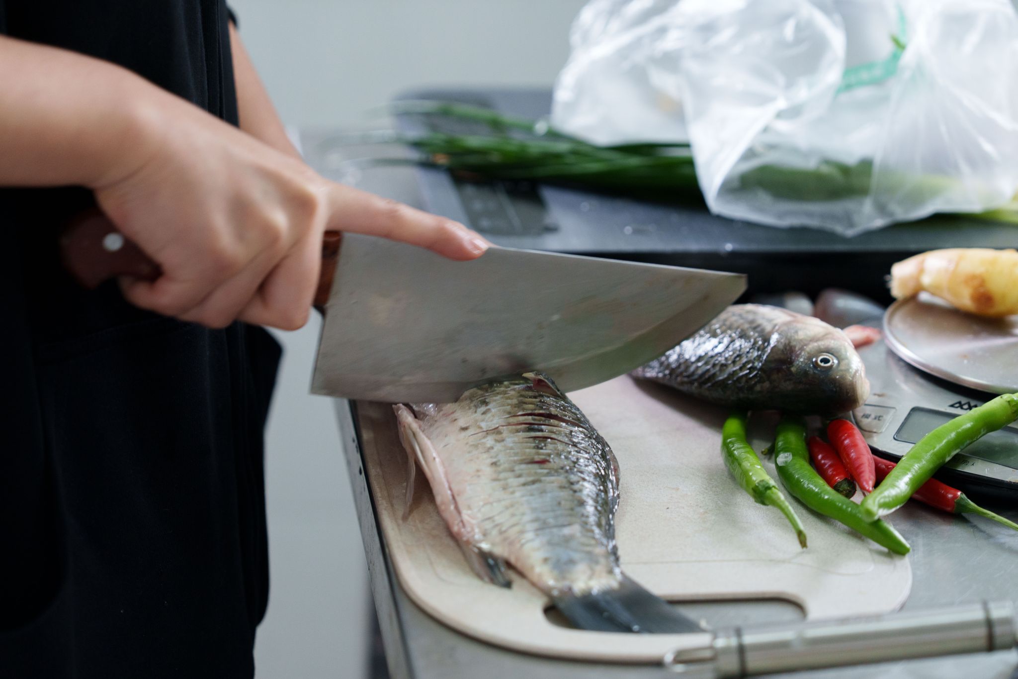 下午一点半,水产品加工车间内热闹非凡,各组参赛选手同台竞技。选手们自备食材,完成鱼鳞、内脏等前期处理后,根据菜品需求进行深度加工,或切片备做鱼片粥,或切花刀便于入味。