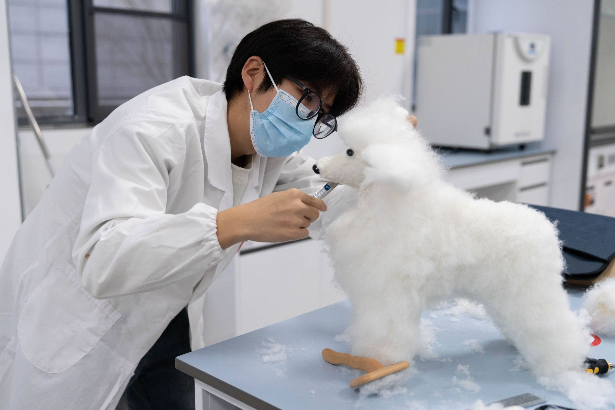 比赛在紧张的氛围中正式开始,选手们需要在160分钟内,给带有7cm假毛的模型犬修剪出经典的“拉姆装”造型。选手们首先用电推剪为贵宾犬塑造轮廓,这是决定造型整体比例的关键一步,再使用直剪按照拉姆装修剪标准,对模型犬的头部以及躯干进行修剪。优秀的拉姆装要求全身做圆到位、不见棱角,展现出柔和可爱的整体感。在剪刀翻飞间,选手们将这一标准转化为一件件柔和圆润、栩栩如生的作品,萌态可掬的拉姆装模样逐渐显现出来。