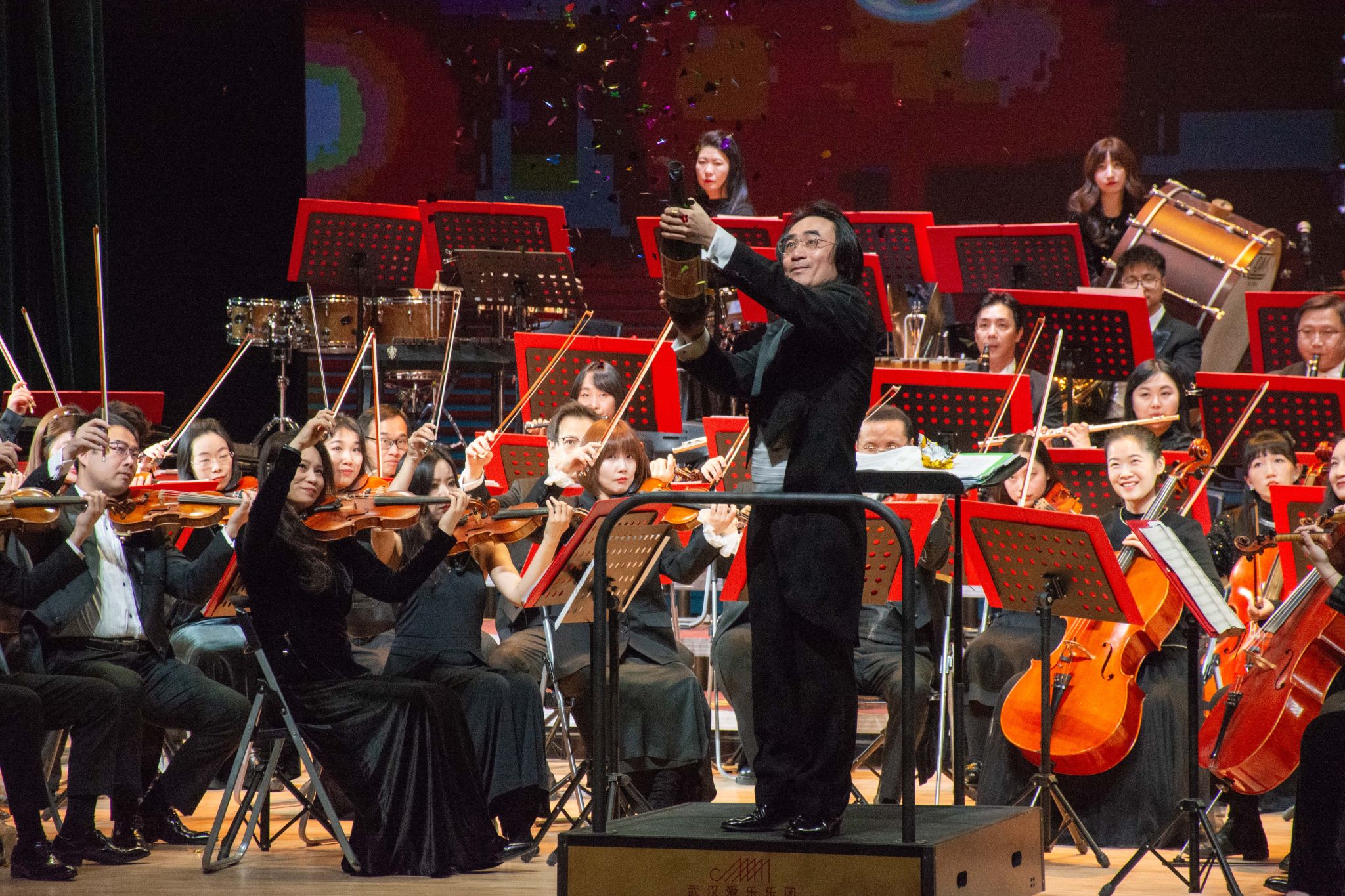 适逢小约翰·施特劳斯诞辰200周年,音乐会精心策划,上半场集中呈现了这位“圆舞曲之王”的波尔卡精品。轻快活泼的《安娜波尔卡》作为开场,迅速点燃现场气氛。随后的《香槟波尔卡》像一场正在“冒泡”的派对,指挥傅人长手持道具香槟,配合乐团奏响的“嘭”声与纷飞的彩带,引发全场阵阵欢呼。