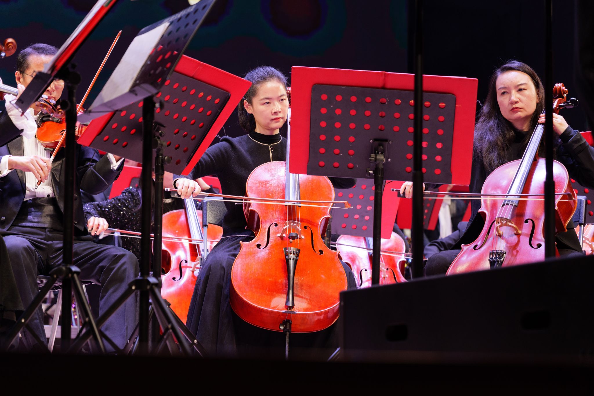 下半场呈现多元风格乐曲,巴洛克时期经典《四季》将中场休息后的气氛重新点燃。《嬉戏曲》《养鸡场》充满童趣。听那成群的野蜂的嗡嗡声,一曲《野蜂飞舞》展现音乐家们的高超技巧。观众耳熟能详的电影《谍中谍》主题曲营造紧张悬疑氛围。墨西哥民歌《库卡拉卡》与《巴西热舞》以其特有的律动带来浓郁的异域风情,整个剧场洋溢着新年将至的节日气氛。