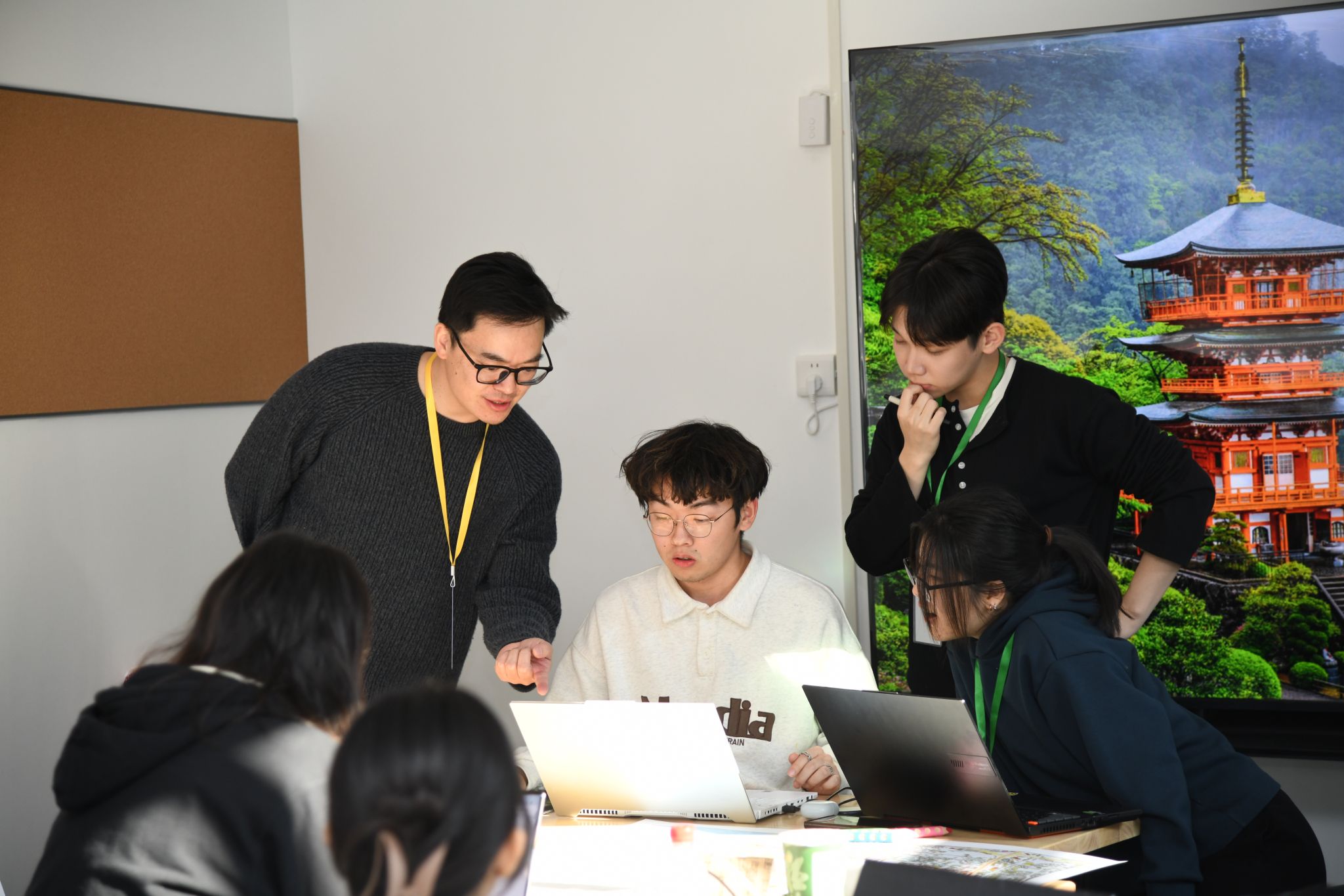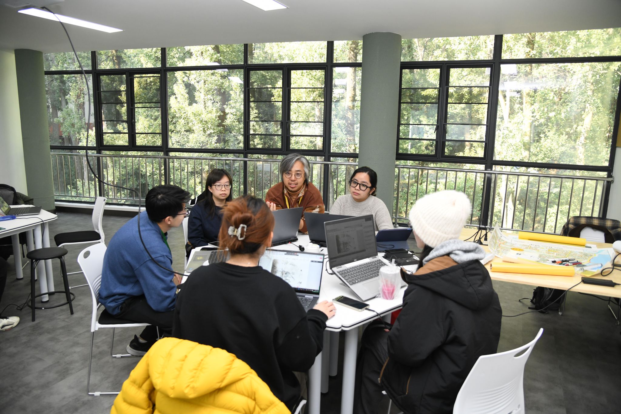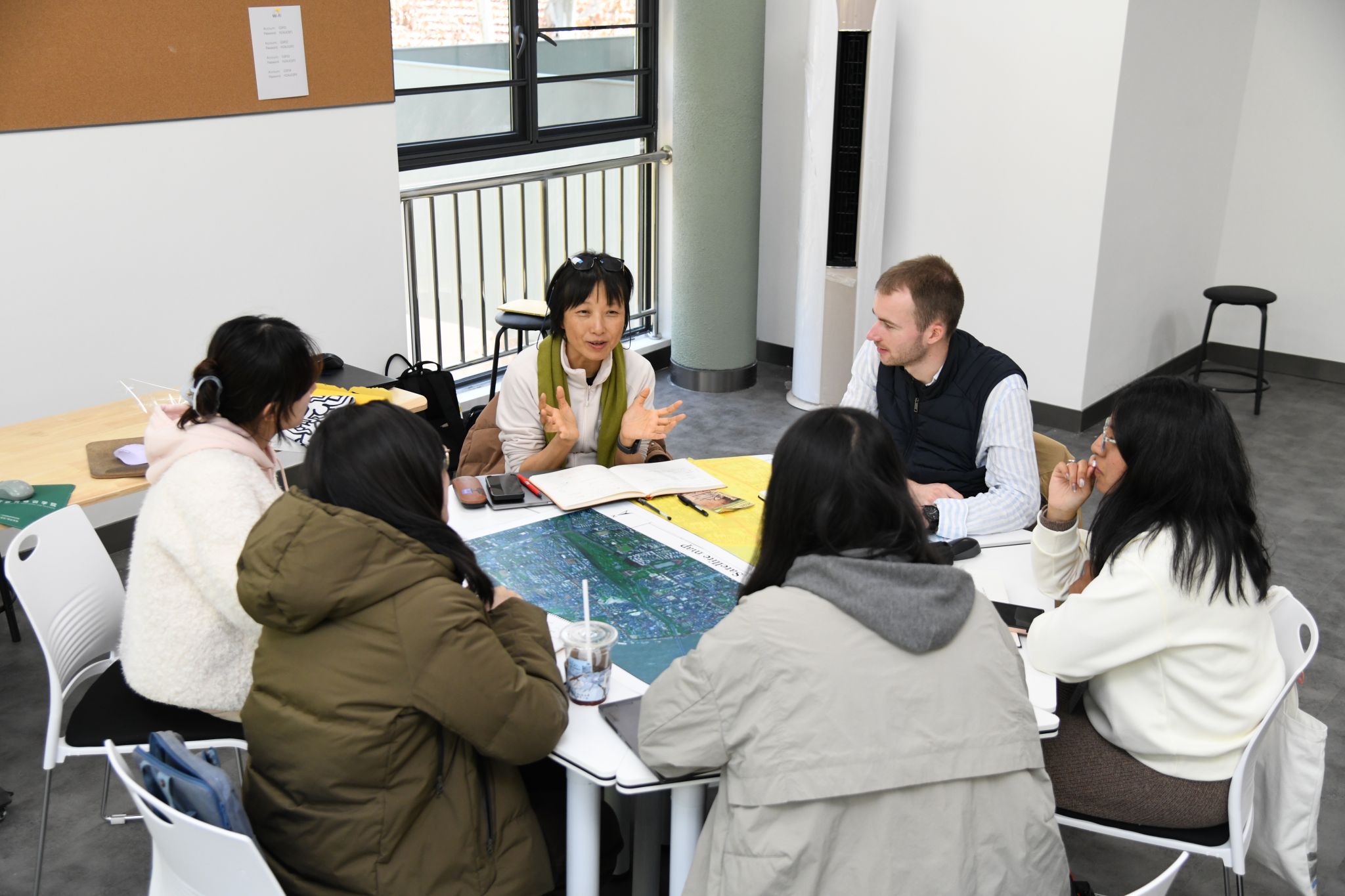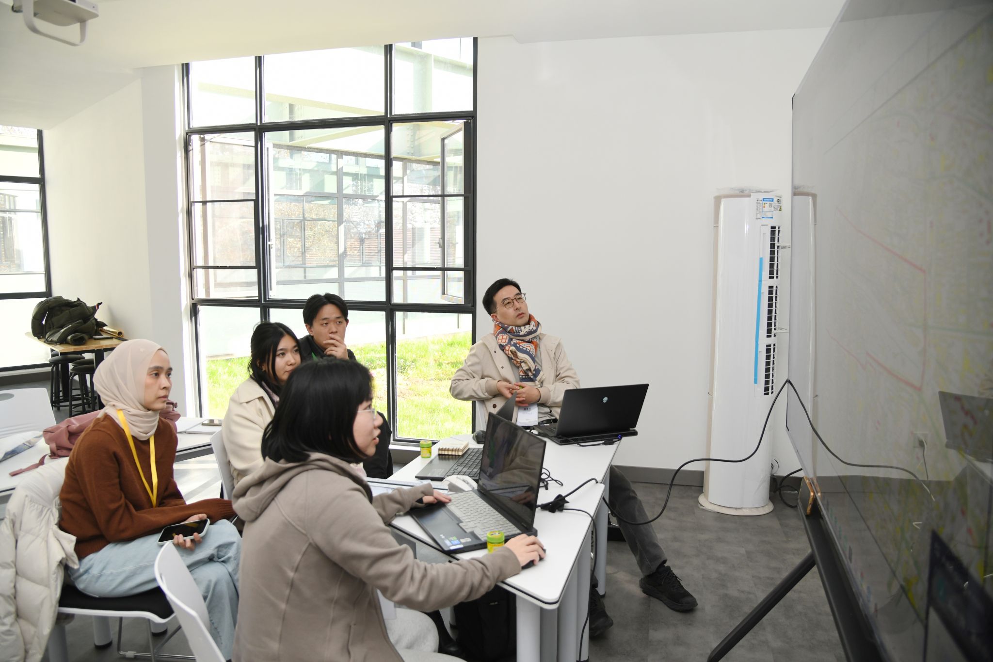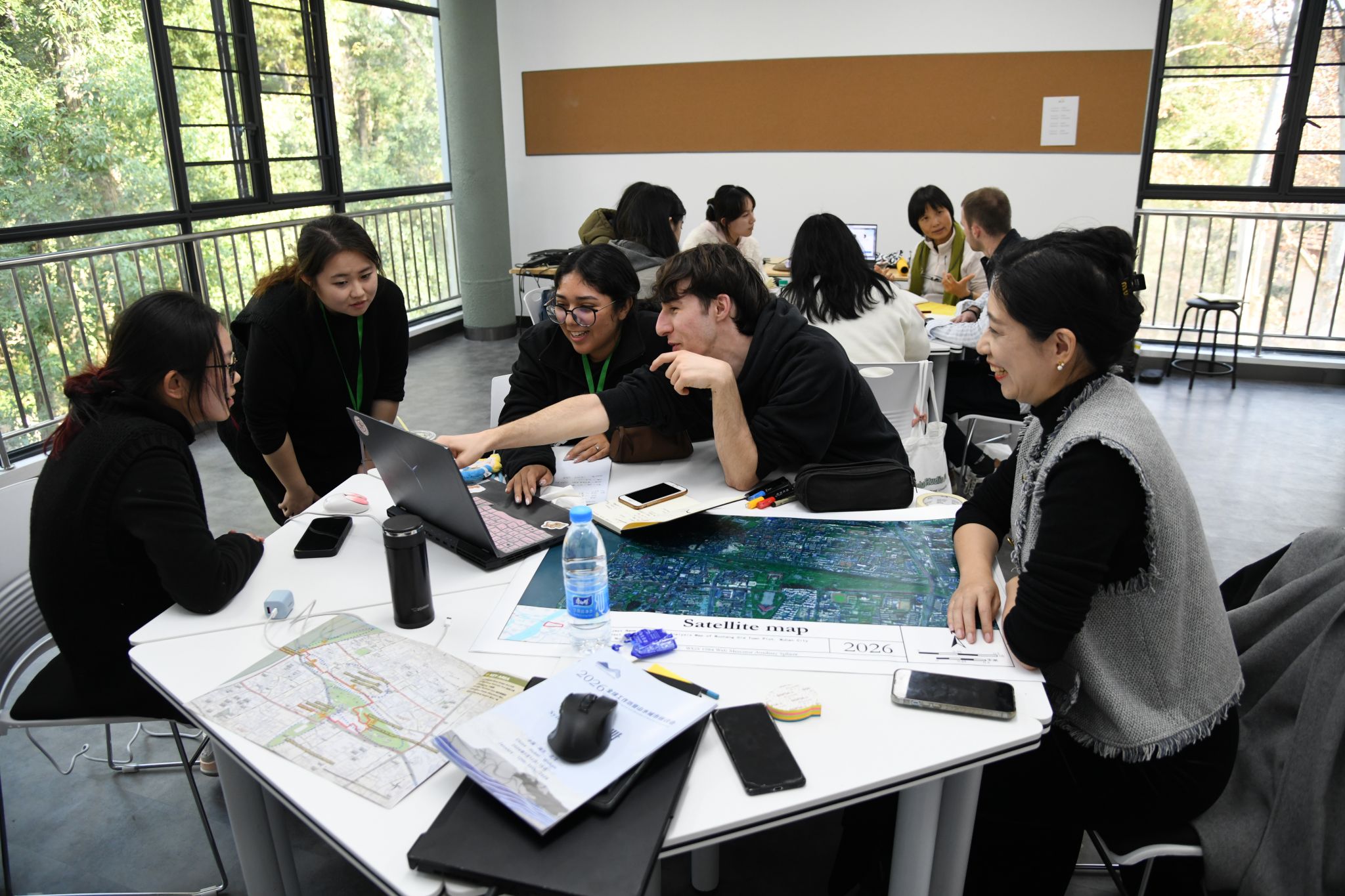 带着踏勘获得的鲜活认知与大量一手资料,8个小组开始了为期两天的封闭式高强度创作。每一间工作室都像一个微缩的“联合国”,混合着多种语言、不同设计软件的操作声和思维激荡的讨论。指导老师们则帮助同学们梳理踏勘发现,厘清从“现场问题”到“设计议题”的逻辑链条。