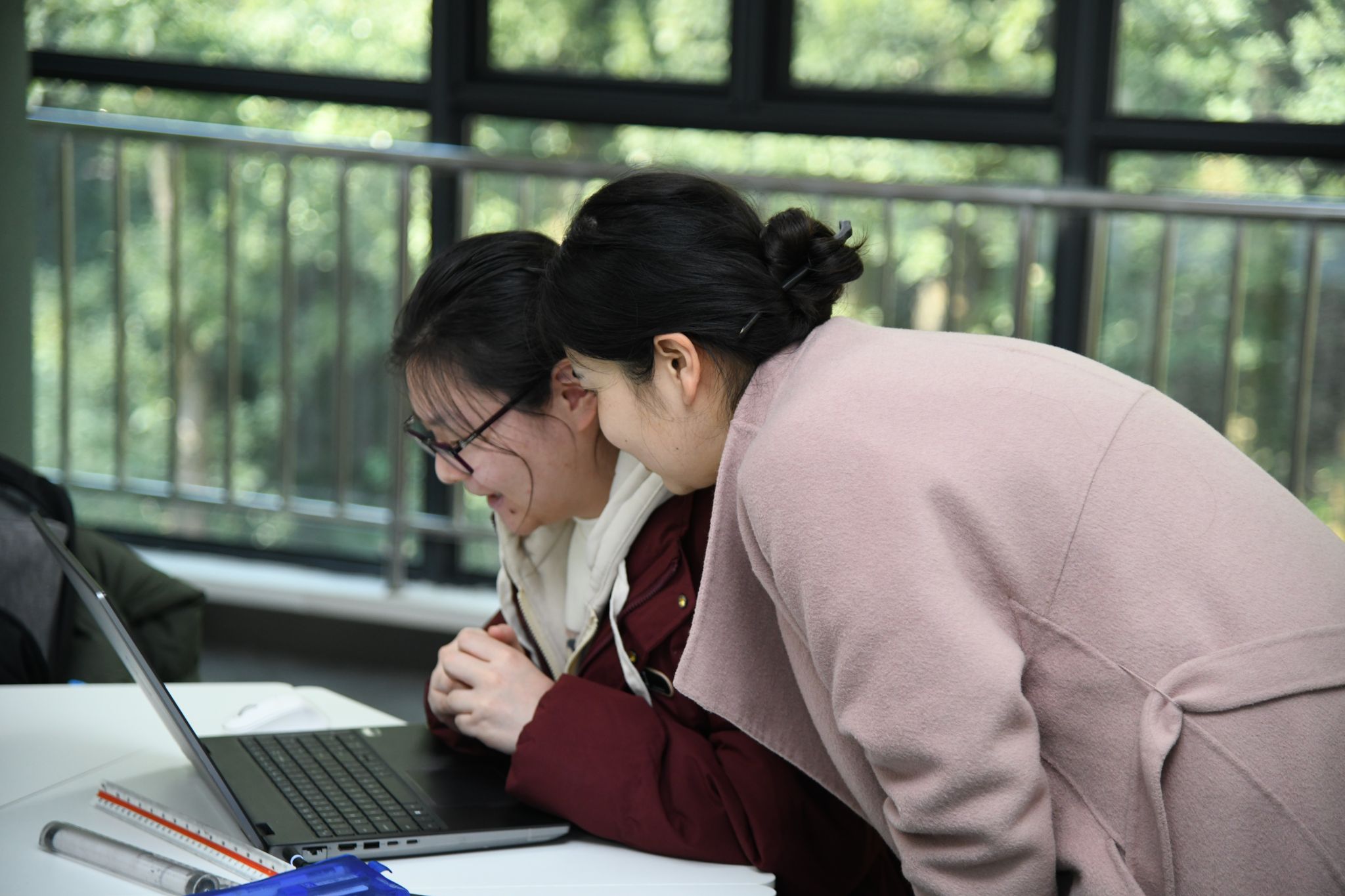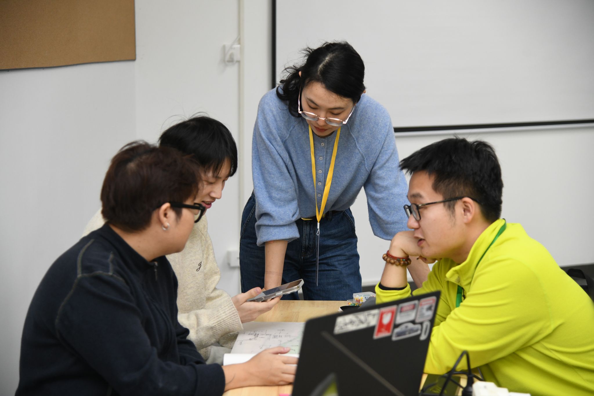 ▲小组指导老师与同学们交流设计方向(记者 徐行 摄)