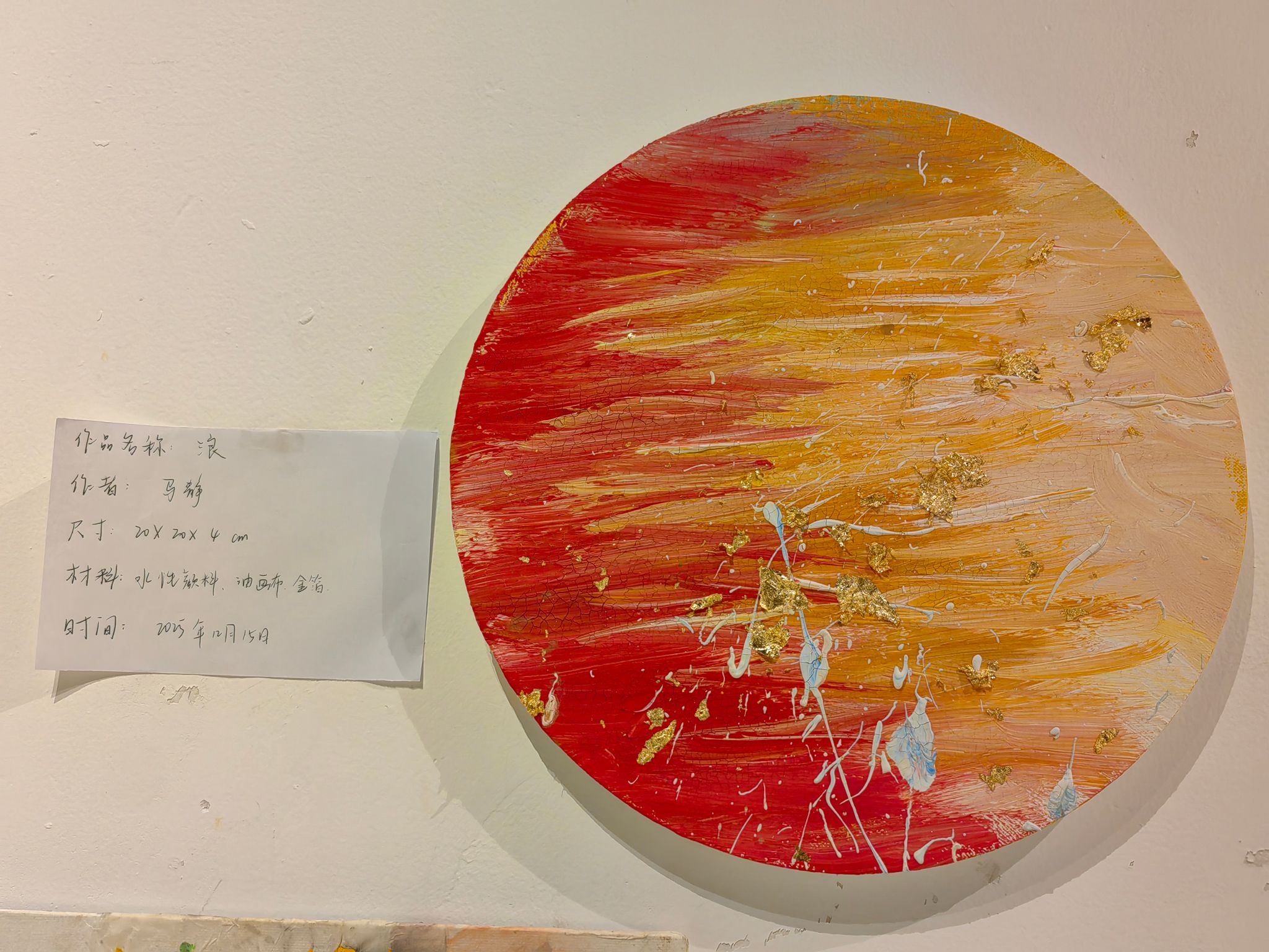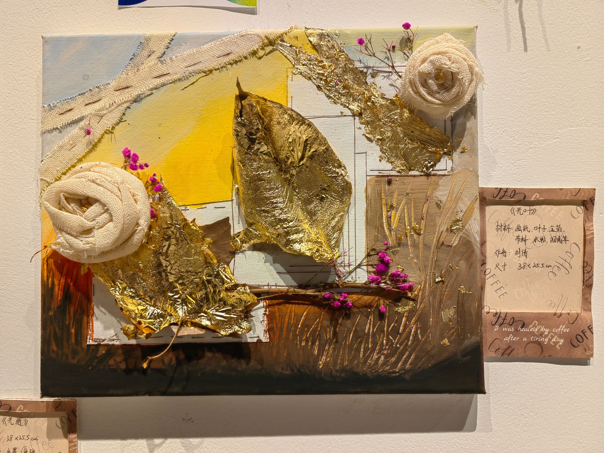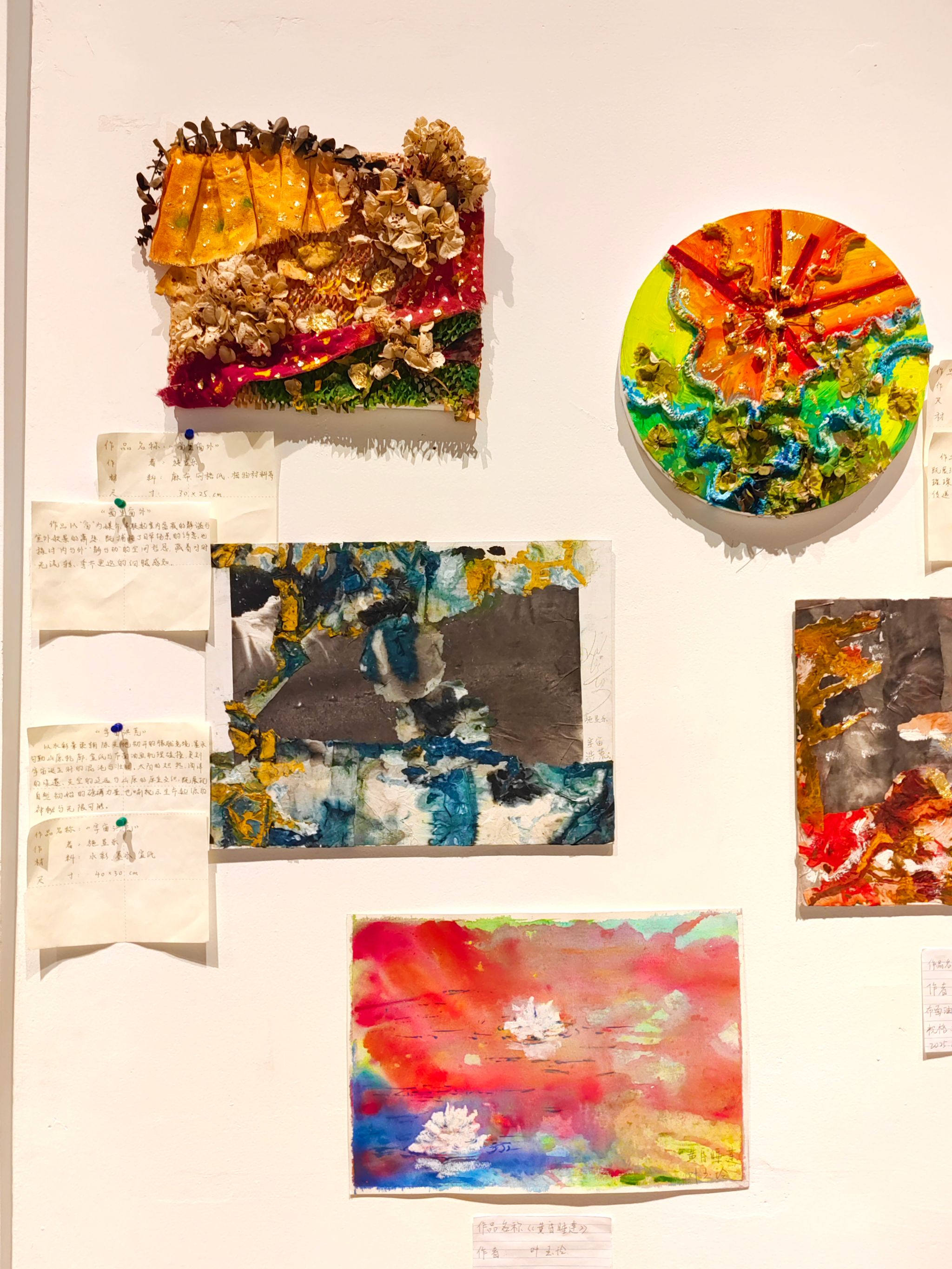 公共管理学院2022级本科生丁芷芮在课程期间分别用蜡笔、水彩、水粉、水墨、纱布、纺织布、干花 、金粉、银粉、竹子等材料创作了多个作品并展出。在其中一幅名为《杂园》的作品中,她用纱布、纺织布、干花等7种材料,让旧物的肌理混着颜料的斑驳,像把荒园里的细碎生机,以随性的方式钉在了画面里。而在作品《Jay Chou 周杰伦》中,她在一根直径为15厘米的青绿色竹子上,写下音乐偶像周杰伦的名字,让笔痕的粗粝与竹身的肌理相融,像把青春的旋律凝在质朴的载体上。“创作不再局限于画笔与颜料,而是融入了对材料本身的观察、解读与再造。”丁芷芮表示,这个展览最动人的地方在于,它让艺术不再是遥不可及的“专业”,而是每个人都可以参与的情感记录与生命表达。