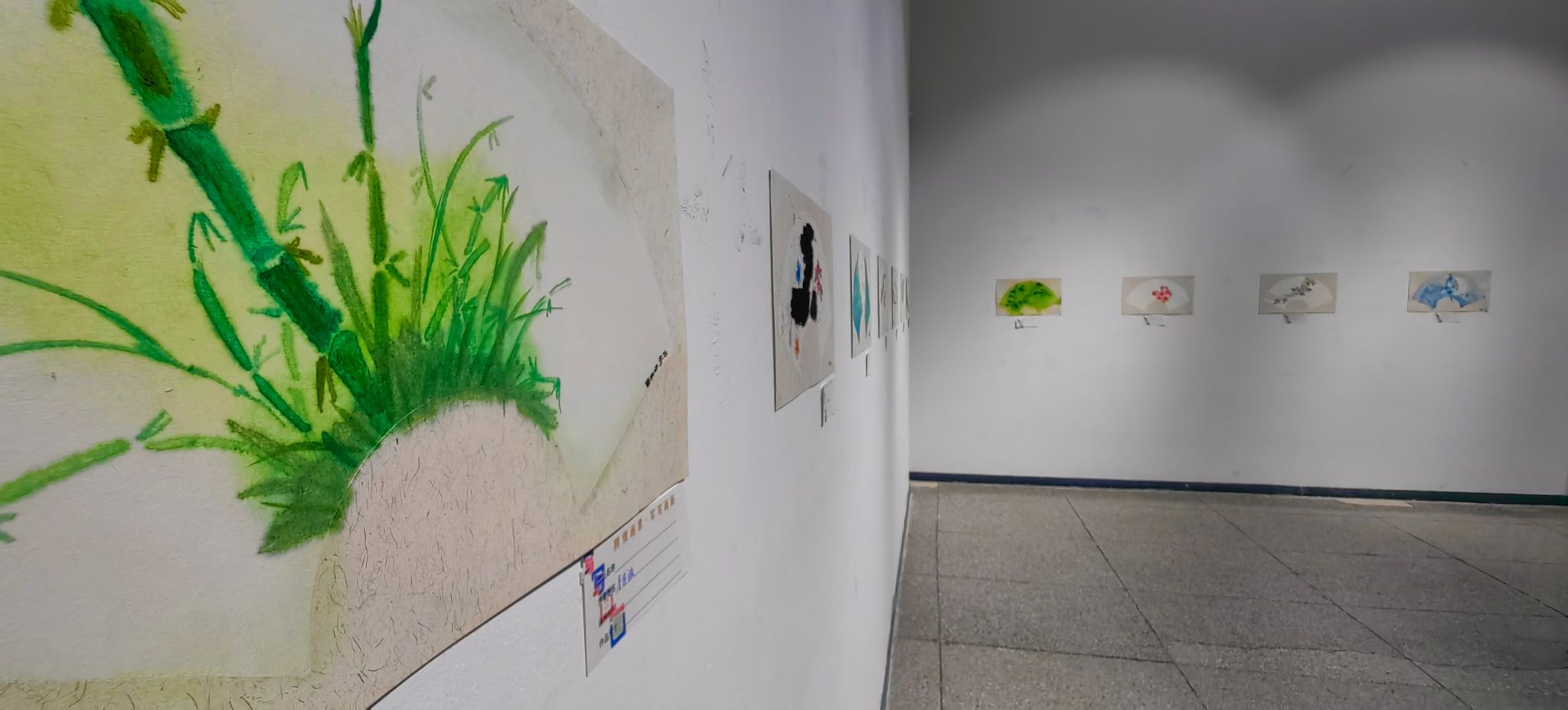 狮山广场的晨曦、实验田的黄昏、教学楼转角的一树花开、南湖岸边的静谧倒影等等,这些校园日常风景在展览现场构建起一道熟悉而诗意的视觉长廊。这些作品源于《水性颜料风景绘画技法实训》课程,同学们以水彩、水墨、水性丙烯等水性材料为媒介,发掘校园丰富的自然景观资源和人文风景,并通过观察光线在树叶间的跳动、季节在色彩中的流转、建筑在时光中的表情等,以鲜明的个人视角与情感投射来描绘出他们眼中的校园。