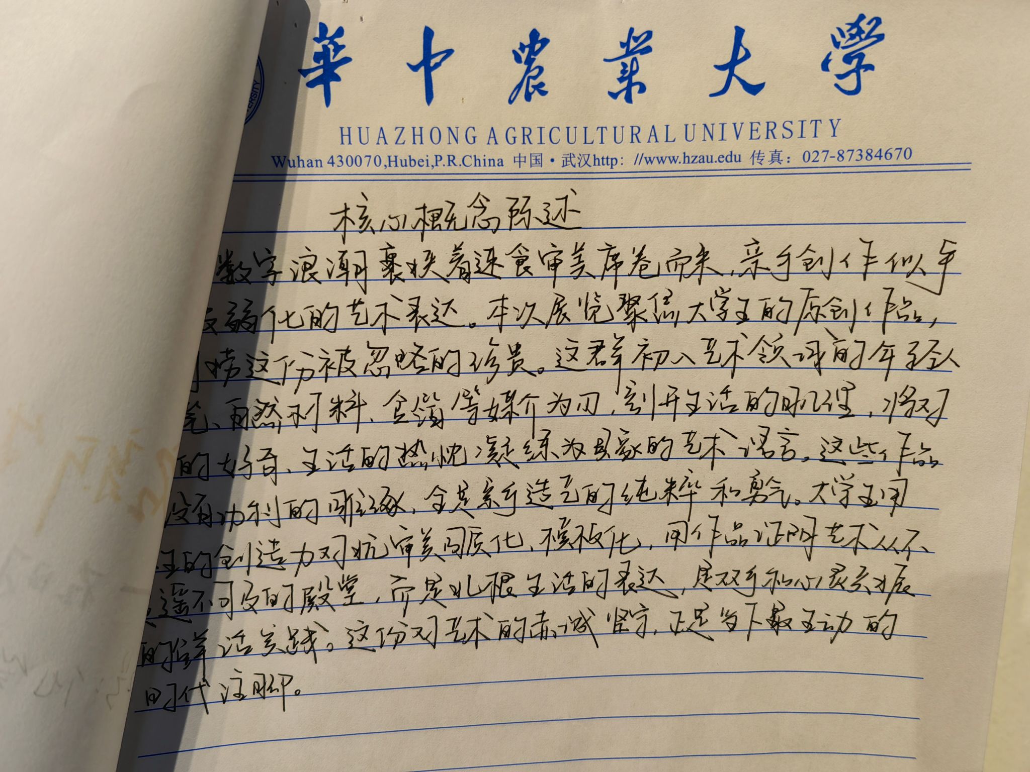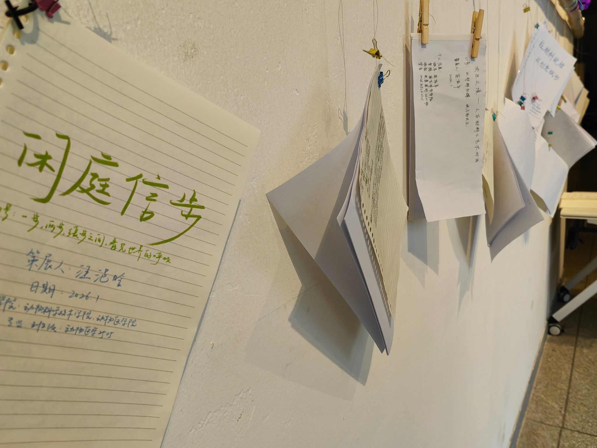与常见的视觉艺术展不同,此次展览特别设置了“艺术文本”展区。在这里,创作手记、策展笔记等,与实体作品并列呈现,构成了作品不可分割的“第二现场”,旨在彰显文字的思辨与材料的感知彼此双向滋养。《艺术展览策划与美术馆》《美术中的多学科思维》等课程正是引导学生通过系统性写作,梳理创作逻辑,深化对材料、自然与自我关系的理解,从而让“手感”与“脑力”同步生长。
