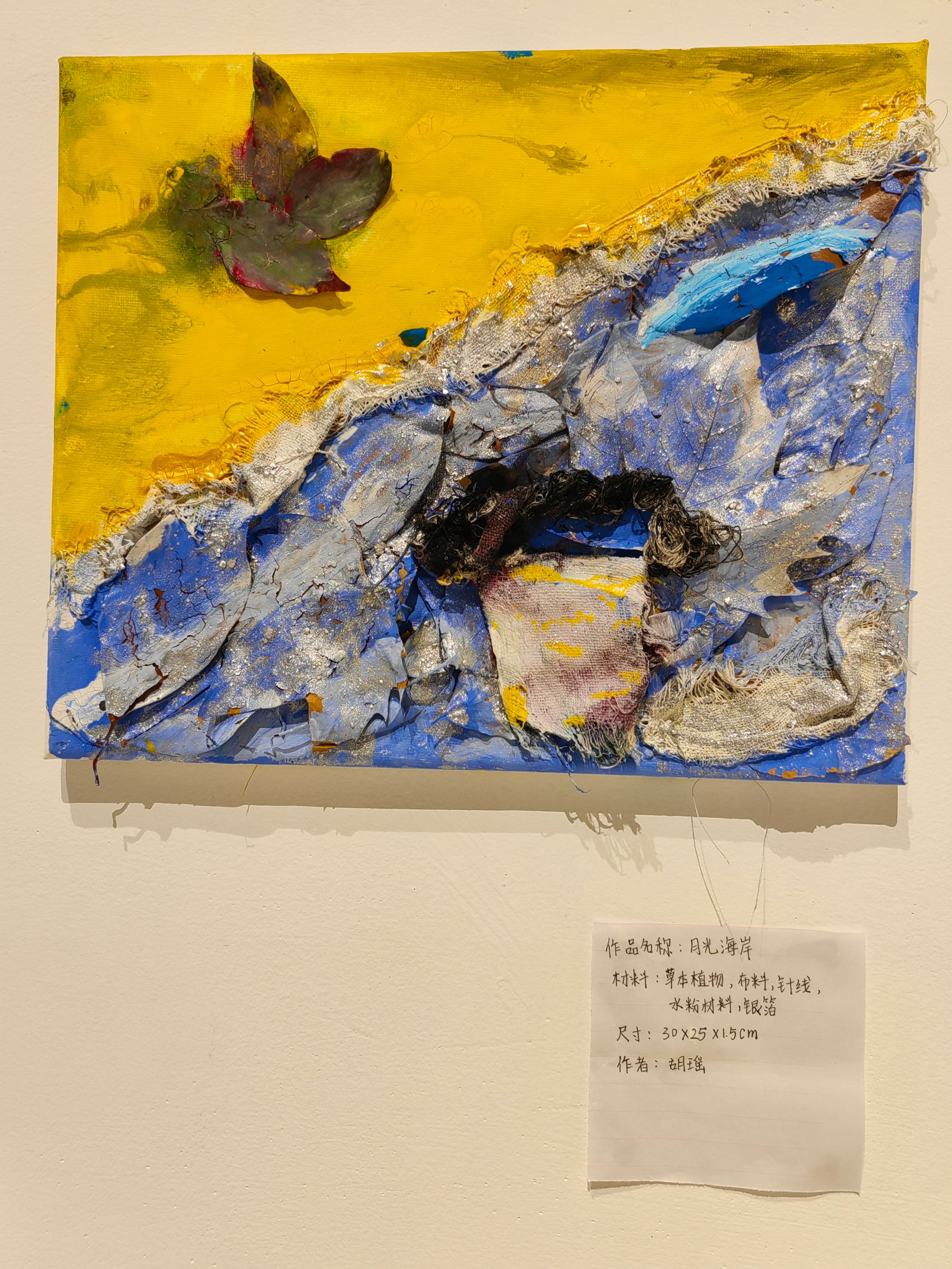 与传统绘画中多以油彩与画布为主不同,锈蚀的金属、斑驳的纸张、纺织物、树皮、干花甚至针线,经过解构与重组,在这里全都被赋予了全新的美学生命和观念指向。《综合材料绘画创意实践》课程全面探讨了艺术材料如何作为“美术创作”以及材料媒介的多样性“材料绘画”表达,同学们从材料的自然、人文属性发现到材料的制作转换,31名同学在课程期间完成各具特色的创意作品,试图表达他们心中对艺术与美的追求与热爱。课程指导教师秦仁强表示,希望同学们能在材料的温度与痕迹中,开启自我、自然与生活的深度觉知之旅。