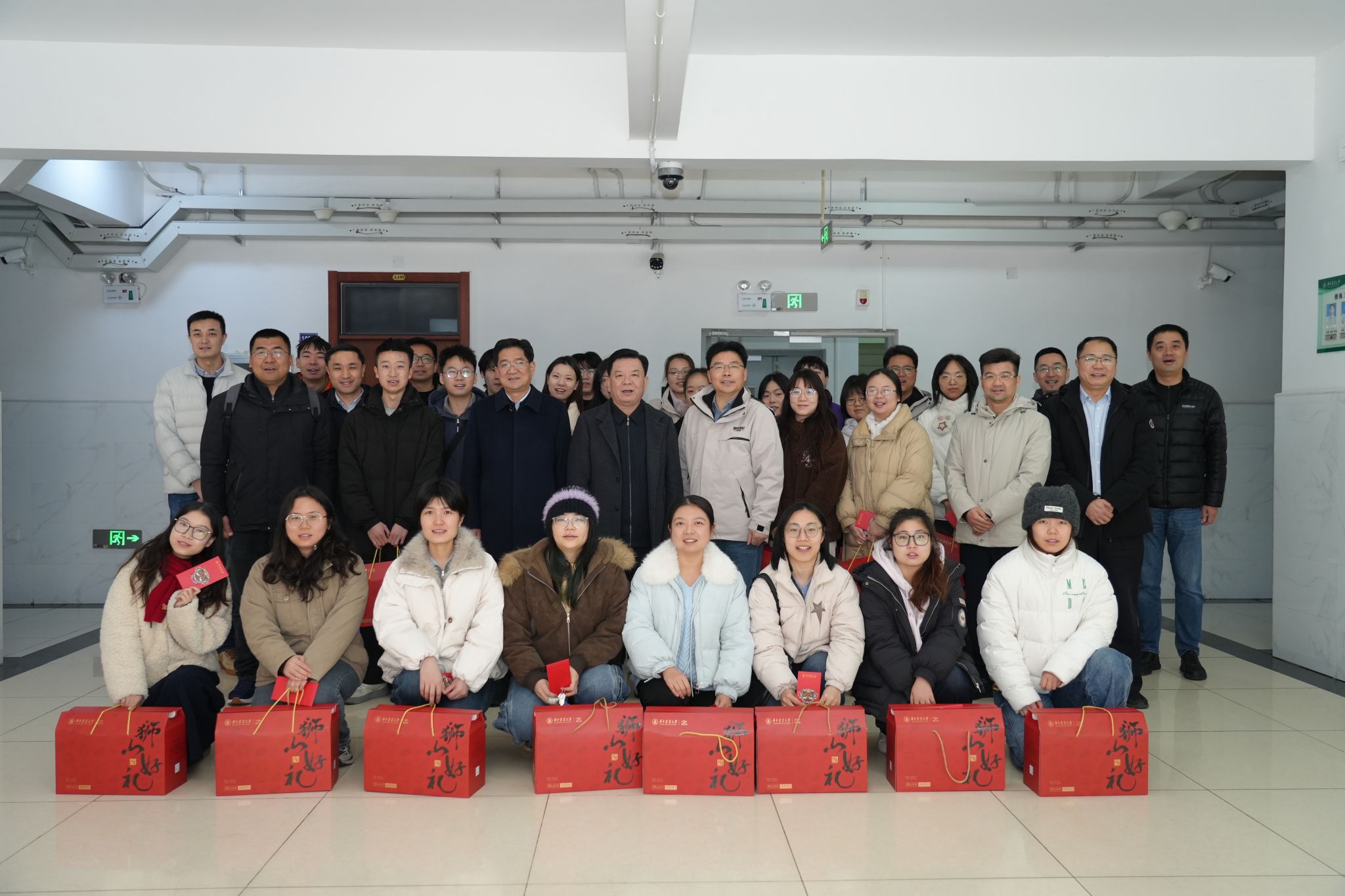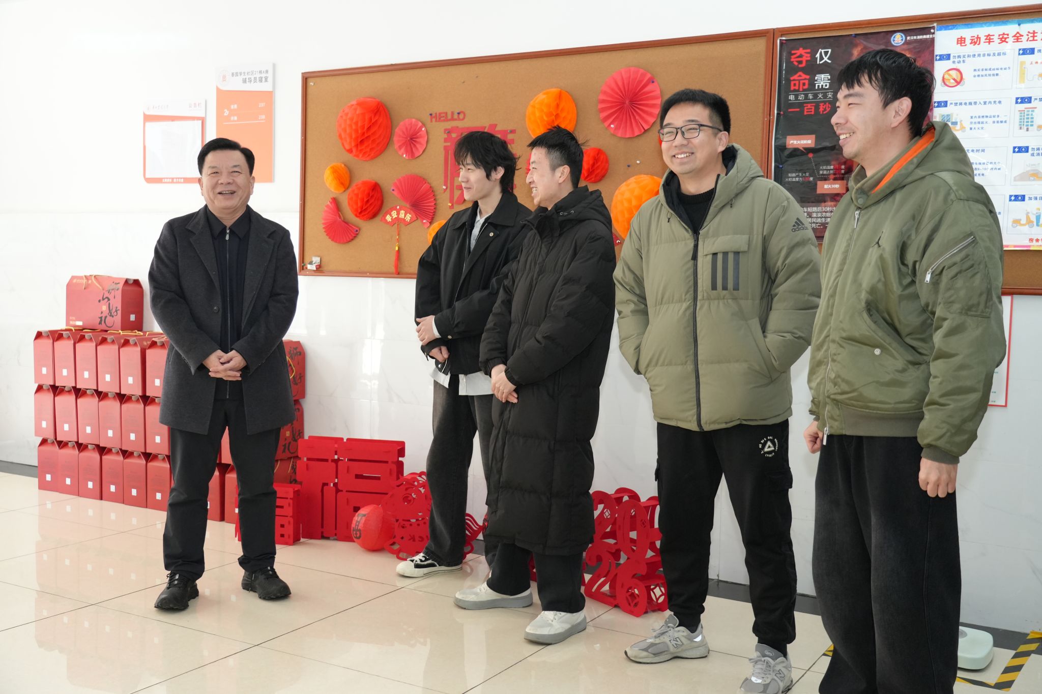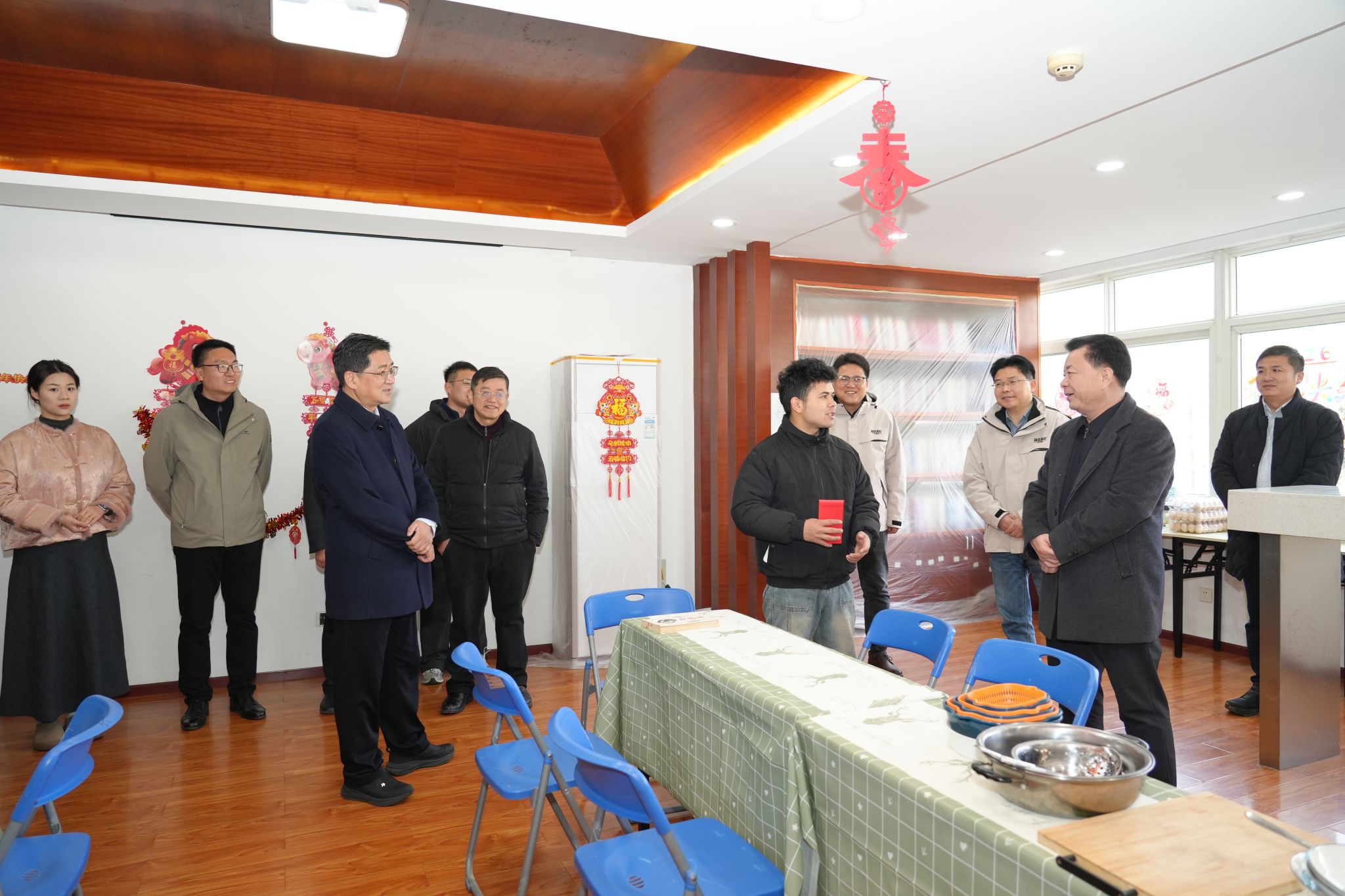 走访慰问期间,姚江林查看了寒假留校学生“小厨房”,在留校学生集中住宿楼栋与同学们交流,亲切询问了大家留校期间的学习和生活情况,并向他们派发红包和新年礼包。