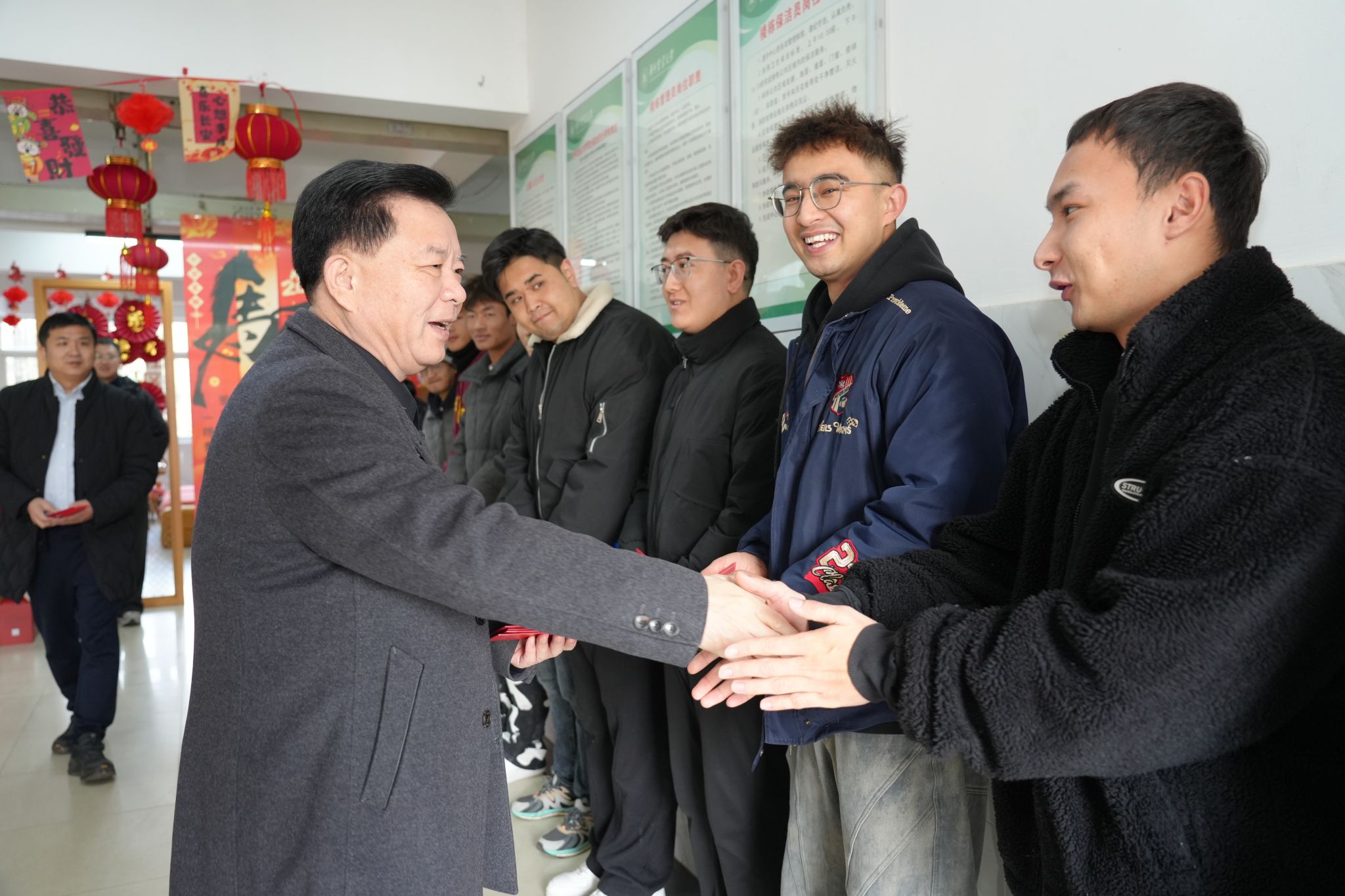 姚江林表示,留校过春节别有一番滋味,希望大家与家人常联系,珍惜宝贵的寒假留校时光,将学习、锻炼等各方面的活动统筹安排好。学校会尽力为大家提供多种保障条件,全力满足大家的所需所盼。祝福大家新春大吉,马跃青云。