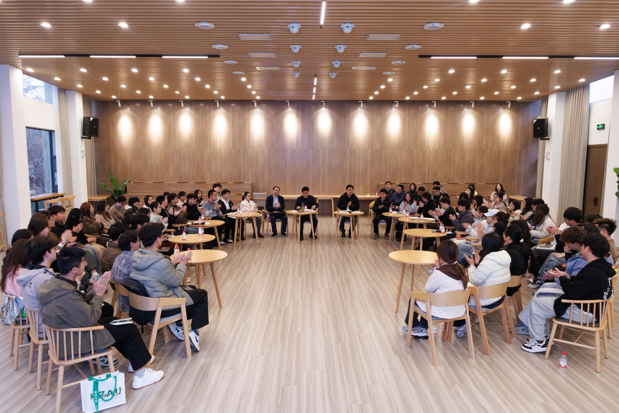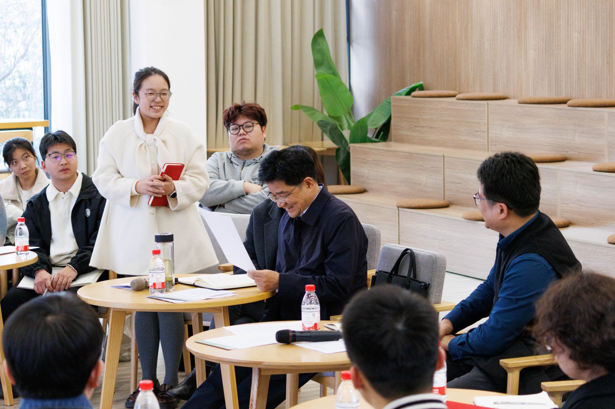 随后,学院学生组织代表结合学院特色作了分享交流。动科动医学院学生会倪茁斌介绍了学院以AI赋能学生工作事务的创新实践。生命科学技术学院研究生会江赛蓝分享开展研究生服务、学术交流等工作举措。公共管理学院团委王成然讲述在志愿服务、社会实践工作中的收获与成长。在自由交流环节中,学生骨干围绕学生骨干培养、激励考核机制、院际资源整合、“人工智能+”应用等方面提出建议,与会老师认真听取并积极回应。