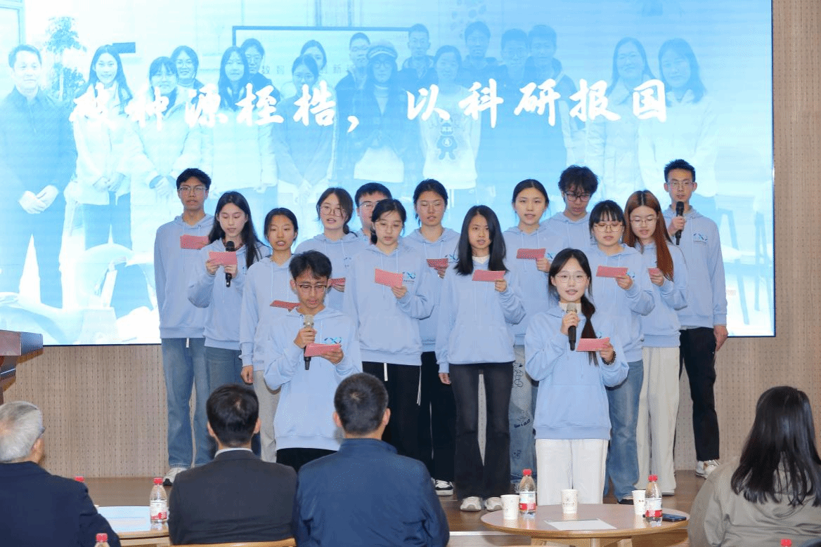 师生互动环节,数智育种创新班学子带来原创诗朗诵《破种源桎梏,以科研报国》,铿锵有力的朗诵表达出他们攻坚种业“卡脖子”技术的决心与强农担当。生物制造创新班学子合唱《夜空中最亮的星》,精彩演出感染全场,展现出创新班学子的蓬勃朝气。