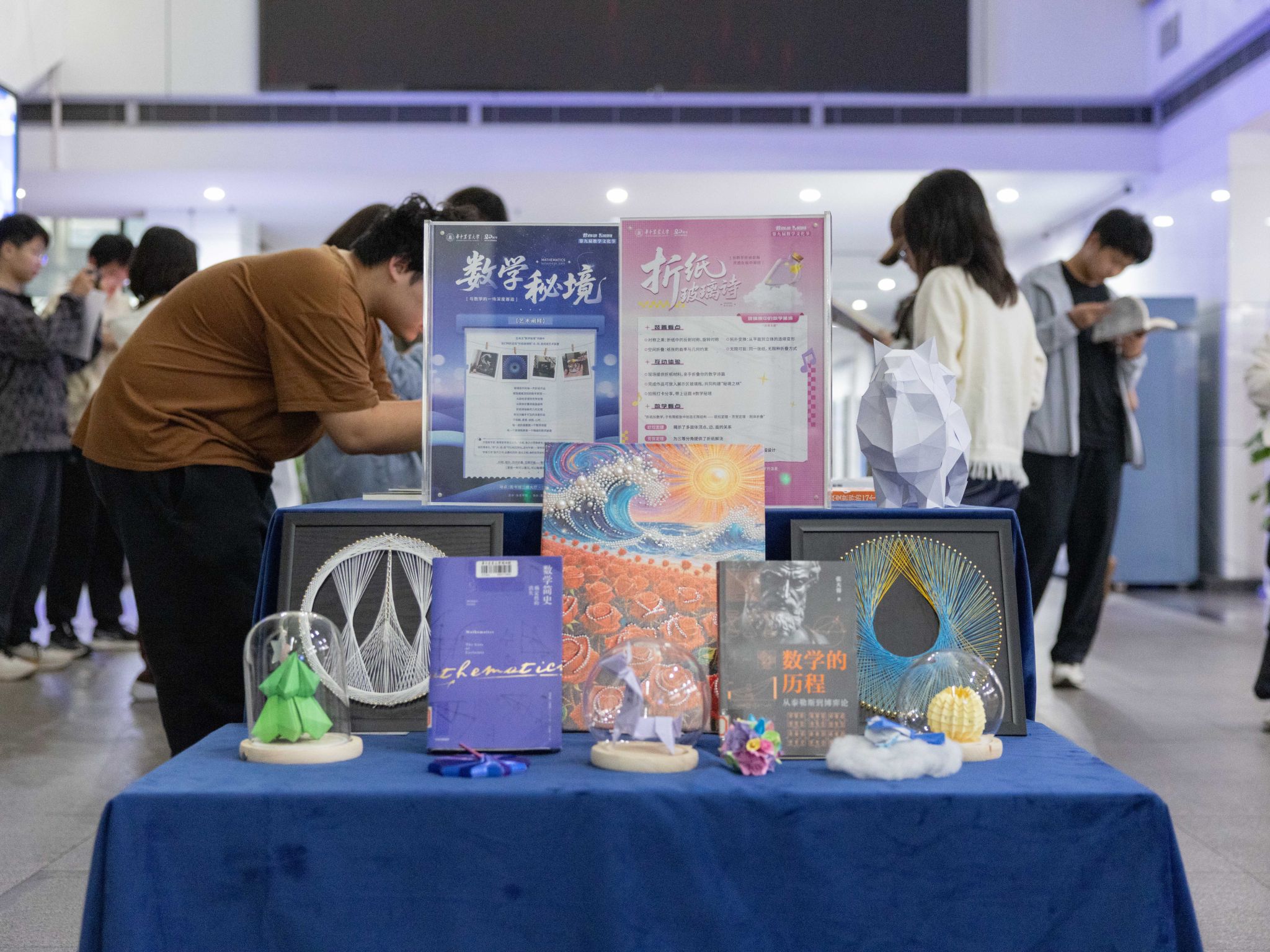 展览同步陈列了《不焦虑的数学思想》《寻找对称》《微积分简析》等科普读物,与手工作品形成呼应,多元展现数学之美。互动体验区提供折纸材料,吸引师生动手体验折纸艺术,共同构建“秘境之林”。