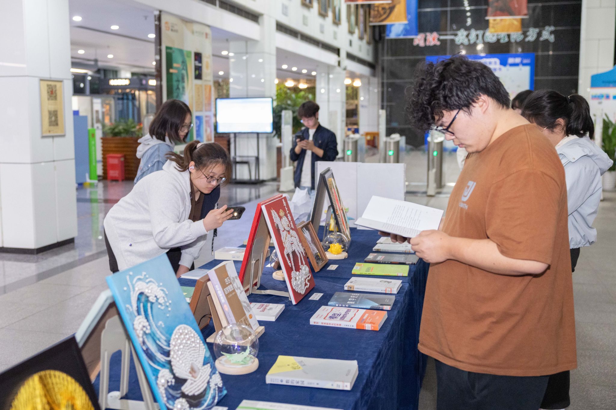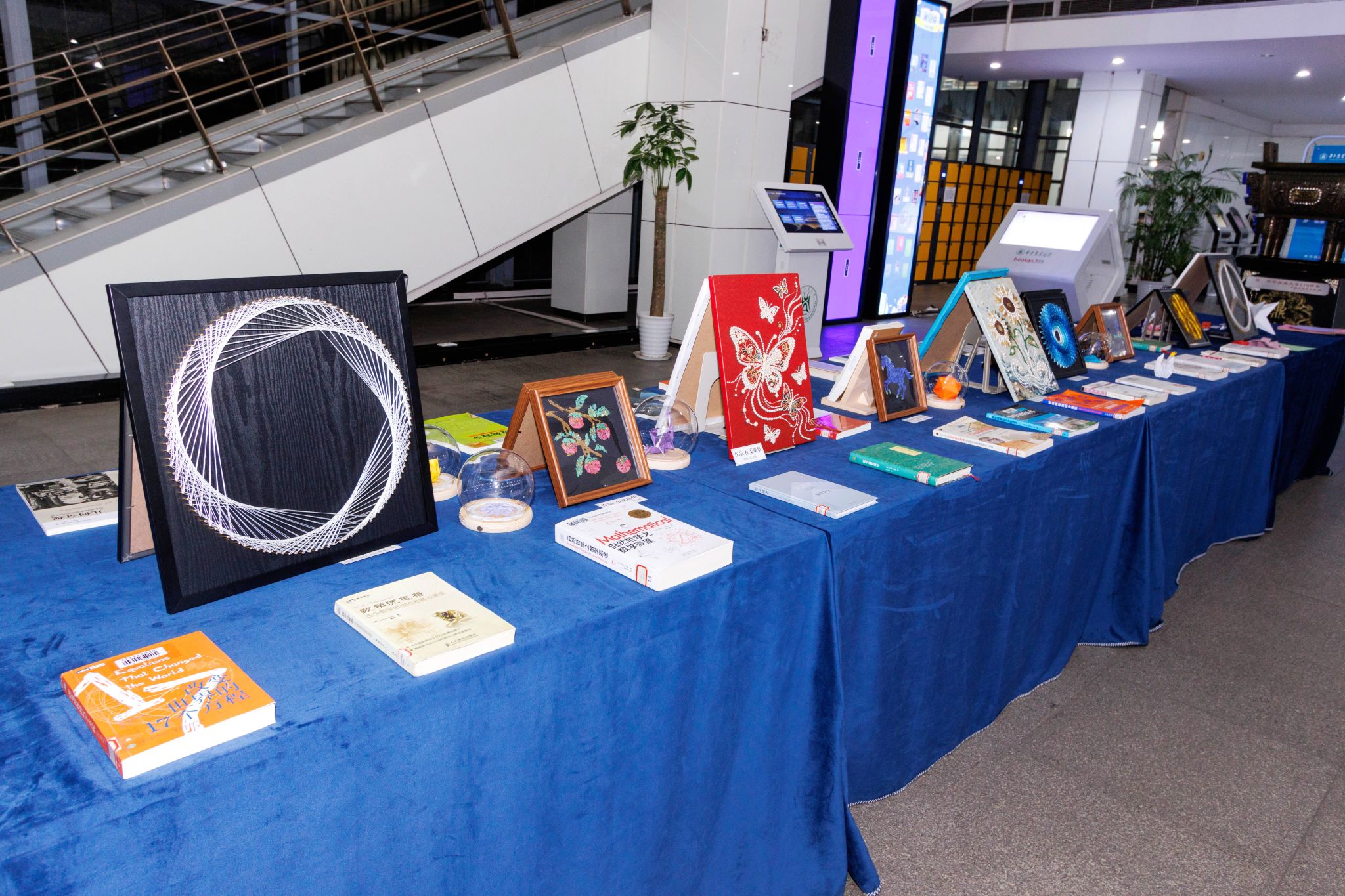 南湖新闻网讯(学通社记者 方庆琳)近日,第九届数学文化节“数学秘境”主题书展在图书馆二楼大厅启幕。本次展览以“指尖绽放的数学艺术”为特色,数十件线绳艺术、折纸、螺钿、珍珠画作品与数学读物交织展出,引导师生在动手与观看之间,重新理解数学的可感、可触、可创造之美。