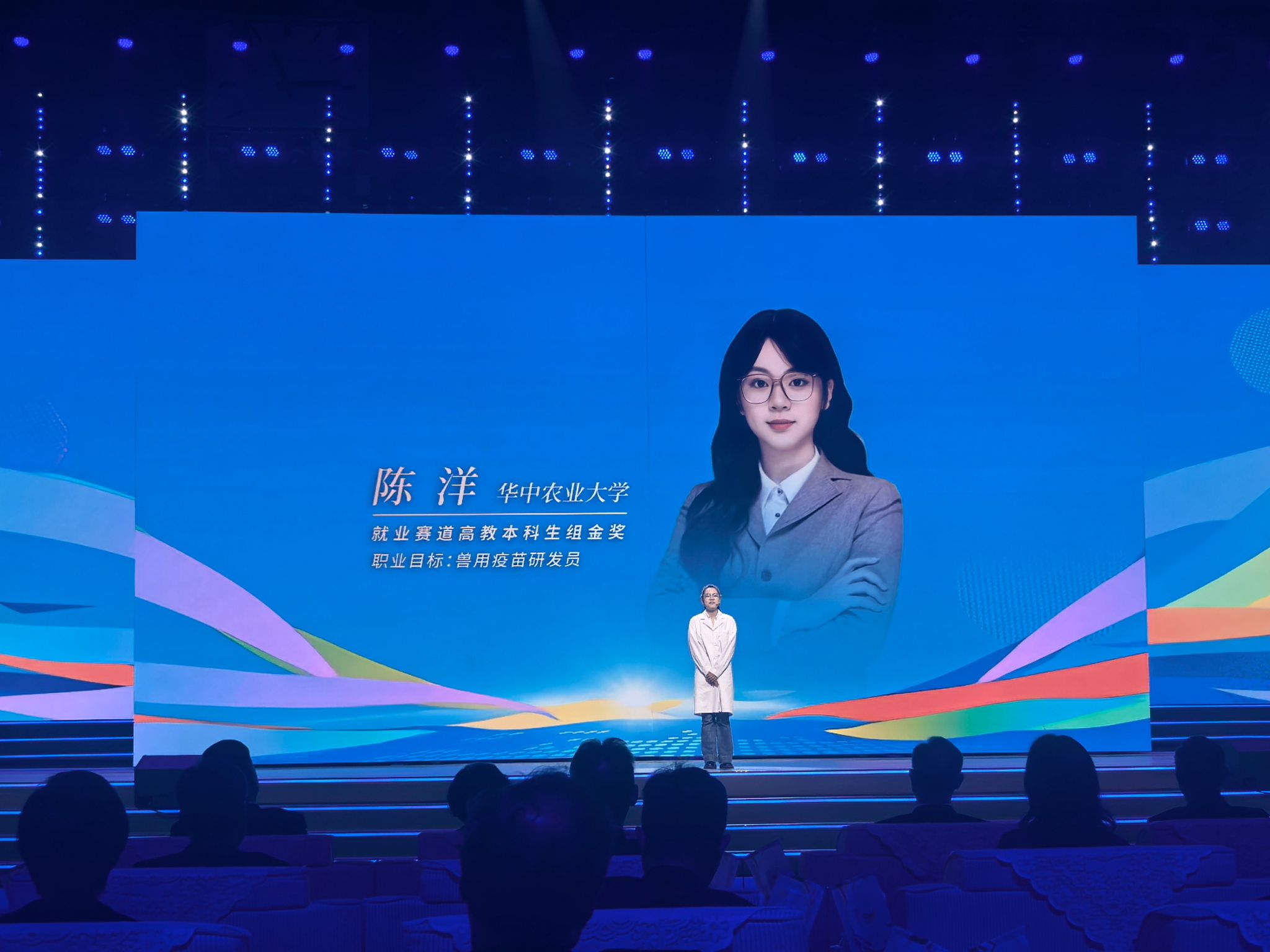 动科动医学院2022级动物医学专业本科生陈洋获就业赛道本科生组金奖。本科在读期间,她在陈焕春院士、金梅林院士的精神指引下,通过自我认知和多渠道职业认知,明确了兽用疫苗研发的就业方向。大赛期间,她对照岗位能力模型逐项提升——从国家重点实验室课题研究,到科前生物实习参与3款猪用疫苗研发,再到针对猪场疫情暴发参与研发噬菌体裂解酶制剂,累计投稿两篇SCI论文。总决赛现场,她凭借扎实的实践经历和清晰的职业规划获得评委高度认可,并作为优秀学生代表在4月25日颁奖展示活动中登台展示风采。