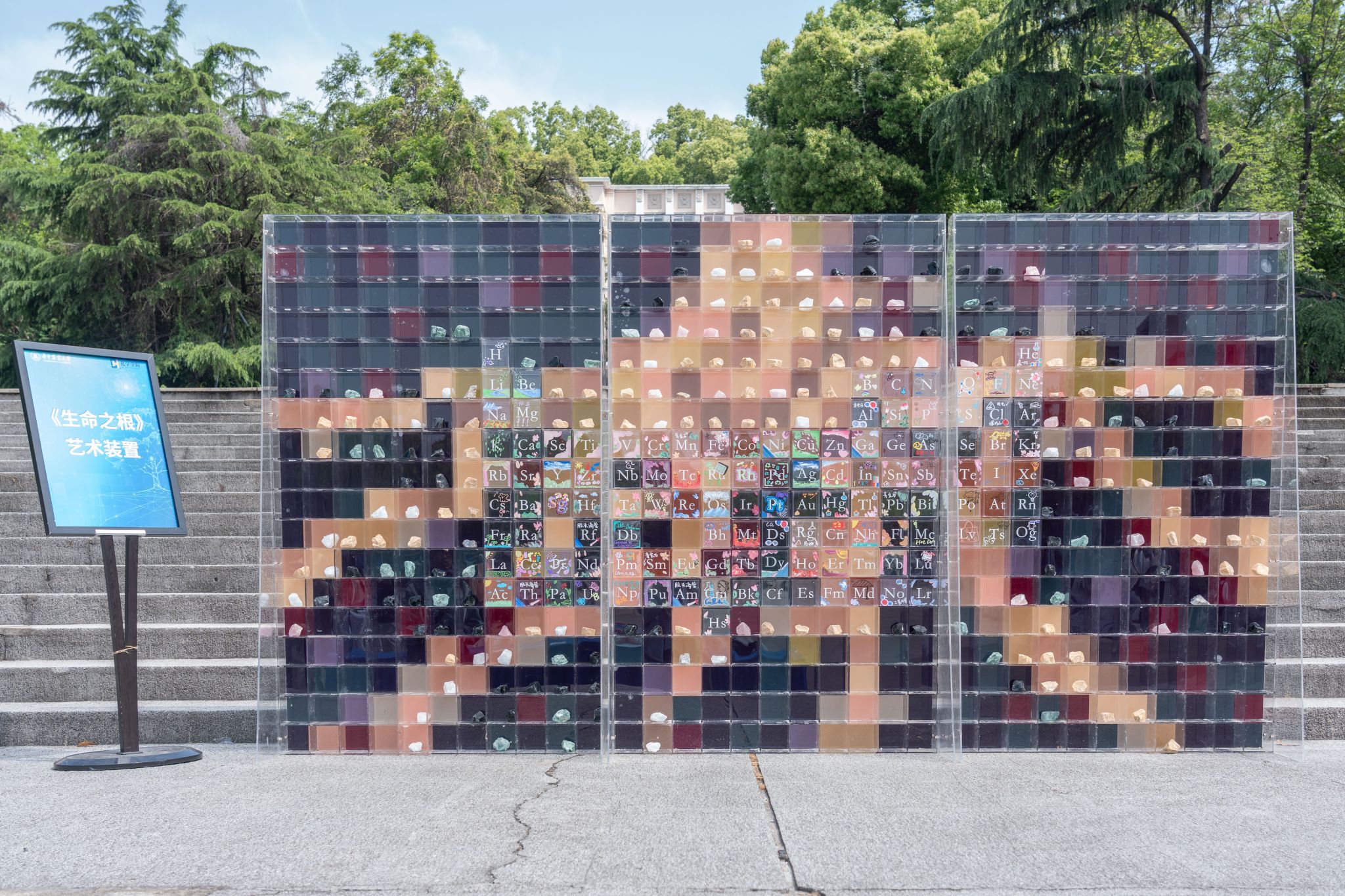 现场,一件名为“生命之根”的艺术装置吸引了众多师生驻足观赏。该作品以树根图案为背景,在对应元素周期表的方格里,放置了约580个分属6种矿石的标本,每一个方格上的图案都由化学学院师生共同绘制完成。从远处望去,这些矿石汇聚于树根之中,焕发出蓬勃的生命力。“我们想传达绿色化学的理念:根从土壤中吸收养分,象征着化学元素所孕育的生命力。”化学学院曾贞表示。