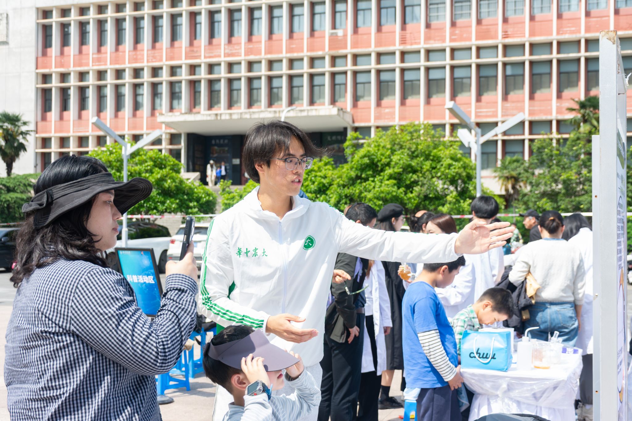 在化学嘉年华环节,狮子山广场与逸夫楼A601智慧实验室同步开放。狮子山广场设有展览区、互动体验区、科普活动区三大板块,并分设魅力化学展台、教师实验展台、自组装仪器展台等区域。逸夫楼A601智慧实验室举办“大手牵小手”科普活动,由志愿者带领武汉科技小记者及华农附小学生共同动手参与化学实验。