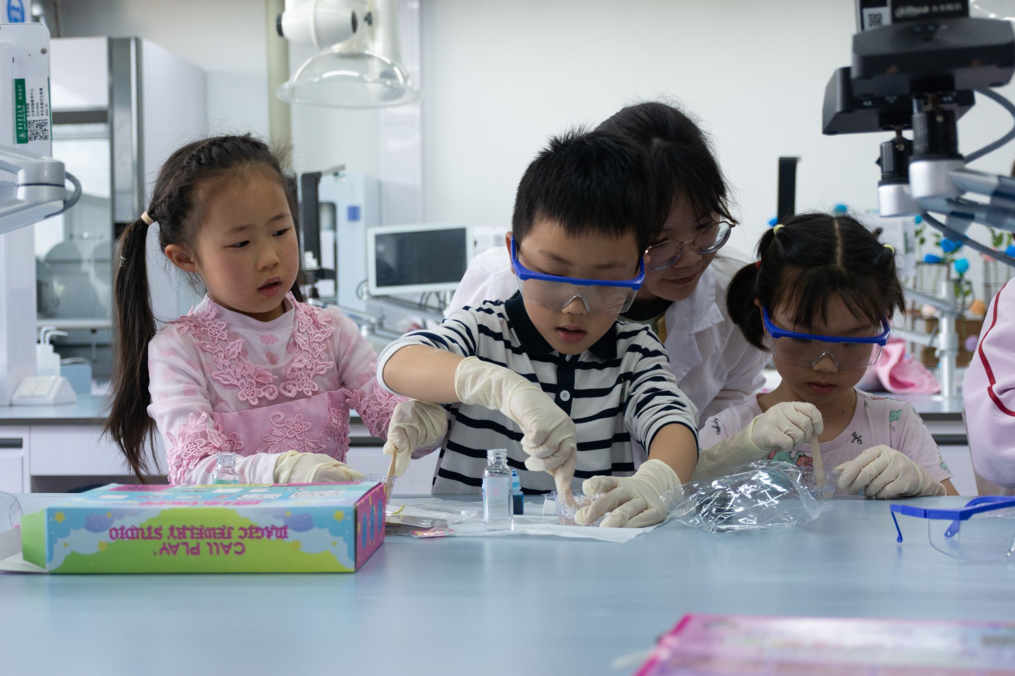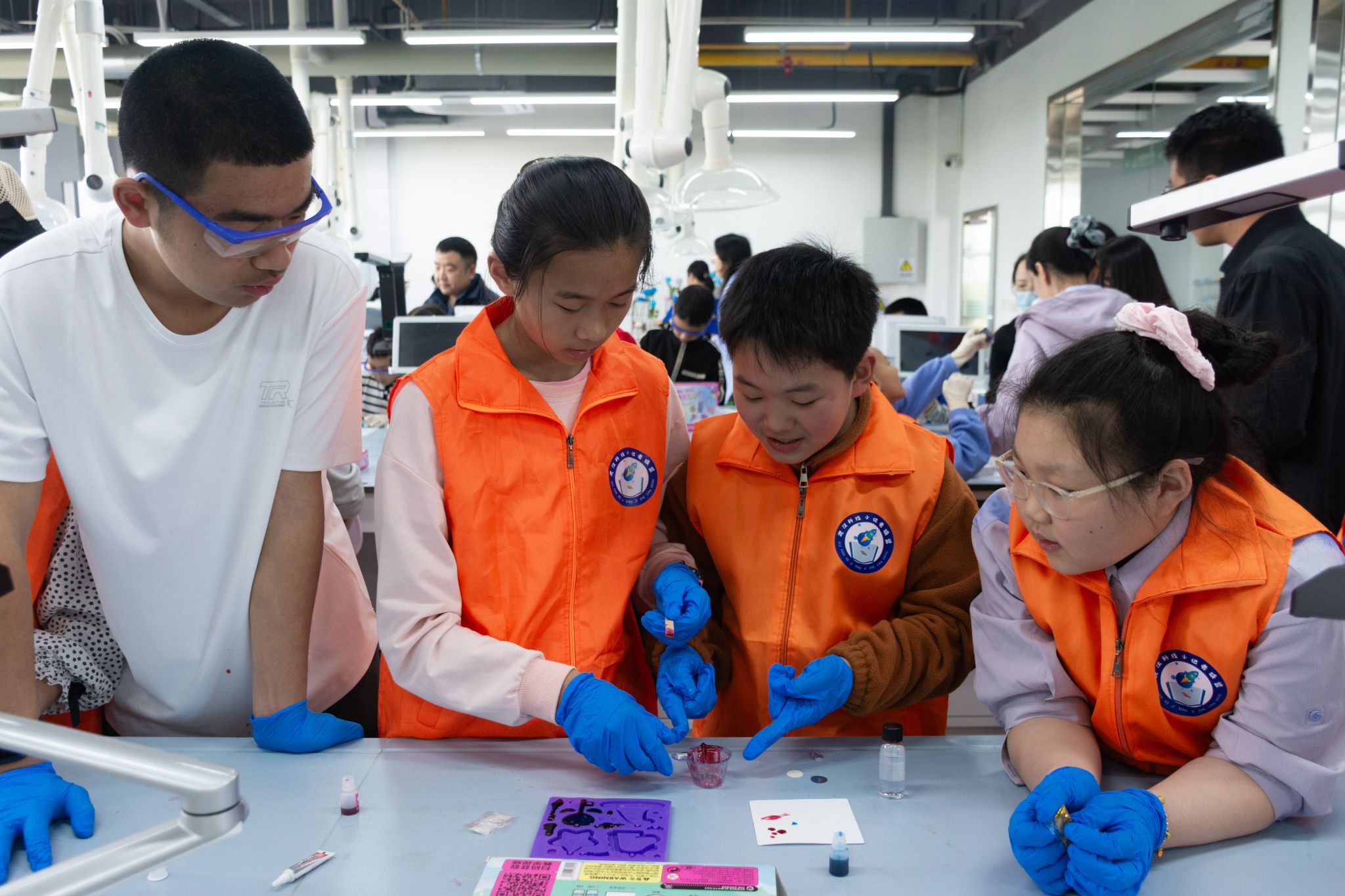 在逸夫楼A601智慧实验室,“大手牵小手”科普活动同步开展。滴胶实验可通过调节反应条件控制反应速率;产气实验使用小苏打和醋酸等常见厨房用品,酸碱反应产生气体在水中形成大量气泡,现象明显,适合在家中自主操作;水中花园实验利用实验室常用且安全的试剂,在烧杯中生长出色彩斑斓的“植物”状沉淀。活动负责人吴园表示,本次活动旨在面向中小学生科普化学知识,激发青少年对化学的兴趣,希望小朋友们保持好奇心,培养科学素养,多动手尝试,未来找到自己真正感兴趣的方向。