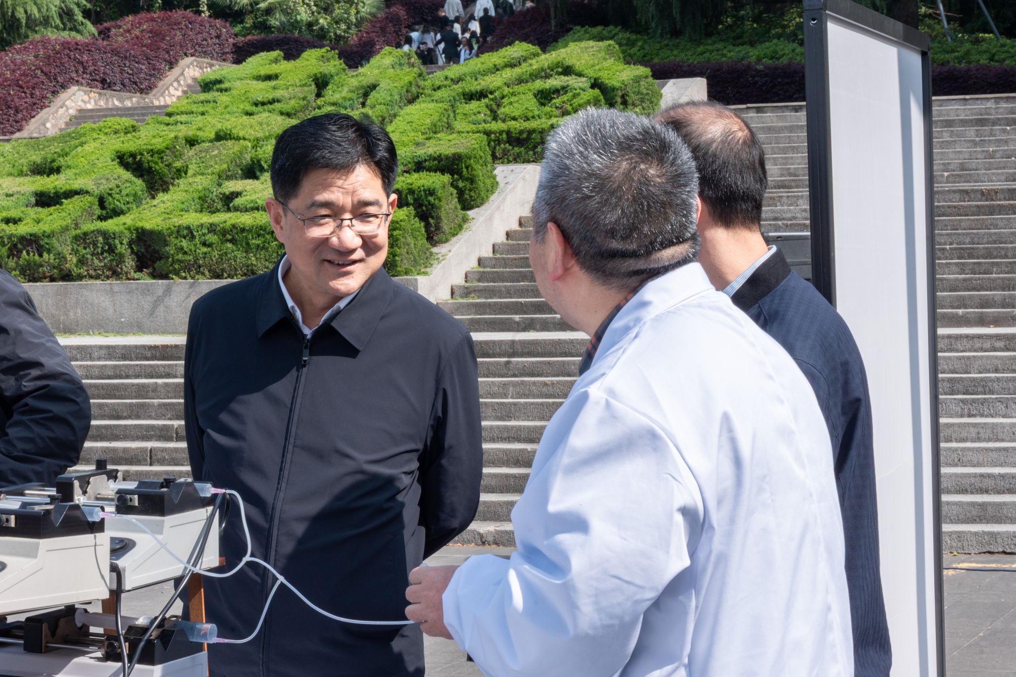 康勤书老师向校党委副书记李向东演示实验装置(李馨瑶 摄)