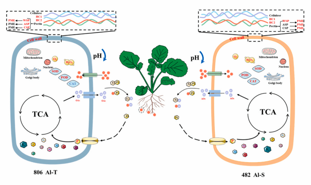 根系分泌有机酸是植物解除铝毒的重要机制。该研究揭示了不同耐性品种采用差异化的有机酸调控策略:铝敏感品种(Al-S 482)在铝胁迫下大幅增加酒石酸的分泌,通过螯合作用降低根际铝离子浓度;而铝耐受品种(Al-T 806)则更侧重于细胞内柠檬酸和草酸的积累与循环,通过液泡区隔化和形成金属配体实现内部解毒。高效液相色谱(HPLC)分析进一步证实,铝耐受品种通过调控TCA代谢,同时优化根系有机酸分泌和胞内有机酸螯合双重机制,在降低铝吸收的同时实现已吸收铝的解毒,以更低的能量消耗实现代谢适应与铝毒防御的协同。这种差异化策略反映了甘蓝型油菜在进化过程中形成的多样化铝适应机制,为品种改良提供了多个潜在靶点。