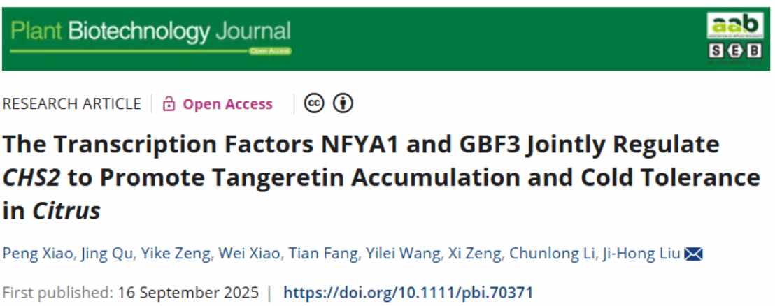 南湖新闻网讯(通讯员 肖鹏)近日,我校果蔬园艺作物种质创新与利用全国重点实验室、湖北洪山实验室刘继红教授团队在Plant Biotechnology Journal杂志上发表了题为“The Transcription Factors NFYA1 and GBF3 Jointly Regulate CHS2 to Promote Tangeretin Accumulation and Cold Tolerance in Citrus”的研究论文。该研究揭示了桔皮素(tangeretin)在柑橘抗寒响应中的重要作用,并探明了一个由CiNFYA1-CiGBF3-CiCHS2共同构成的关键转录调控模块,该模块通过协同激活桔皮素的生物合成显著增强柑橘耐寒性。
