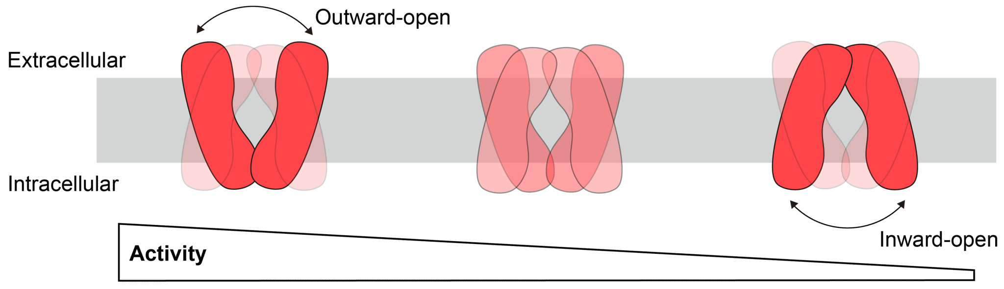 进一步,研究团队运用smFRET技术,在单分子水平可视化分析了OsPT11转运磷酸根过程的动态变化。研究发现OsPT11在多种构象状态之间相互转换,其中,当胞外朝向(outward-facing)构象为主要构象时可显著促进磷的转运活性。相比之下,胞内朝向(inward-facing)构象为主时,磷的转运活性则降低(图2)。基于此,作者对比研究了水稻高亲和力转运体OsPHT1;8(OsPT8)的动态转运过程,发现,尽管这两个转运体在磷酸根结合位点具有保守的氨基酸序列,但其构象动态平衡呈现显著差异:低亲和转运体OsPT11以胞内朝向构象为主,高亲和转运体OsPT8则以胞外构象为主。因此,高、低亲和转运体这种动态性质上的异质性,决定了它们在磷转运效率上的高低之分。该研究结果,很好地解释了领域内一个很有意思的问题:为什么序列相似、结构相同的PHT1转运体却有着不同的磷酸根转运能力?