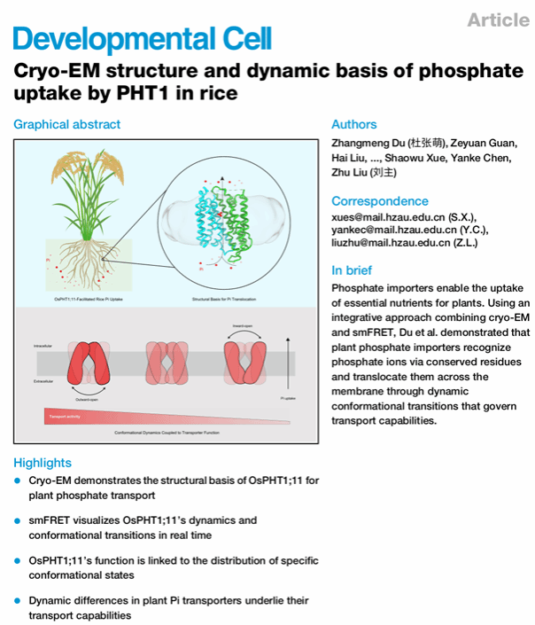 9月25日,华中农业大学刘主课题组联合陈艳可、薛绍武等实验室,在Developmental Cell在线发表题为Cryo-EM structure and dynamic basis of phosphate uptake by PHT1 in rice的研究论文,首次报道了水稻磷酸盐转运蛋白OsPT11的冷冻电镜结构,结合单分子荧光共振能量转移(smFRET)技术,对其构象变化进行了可视化分析,揭示了其识别、转运磷酸根的分子机制。