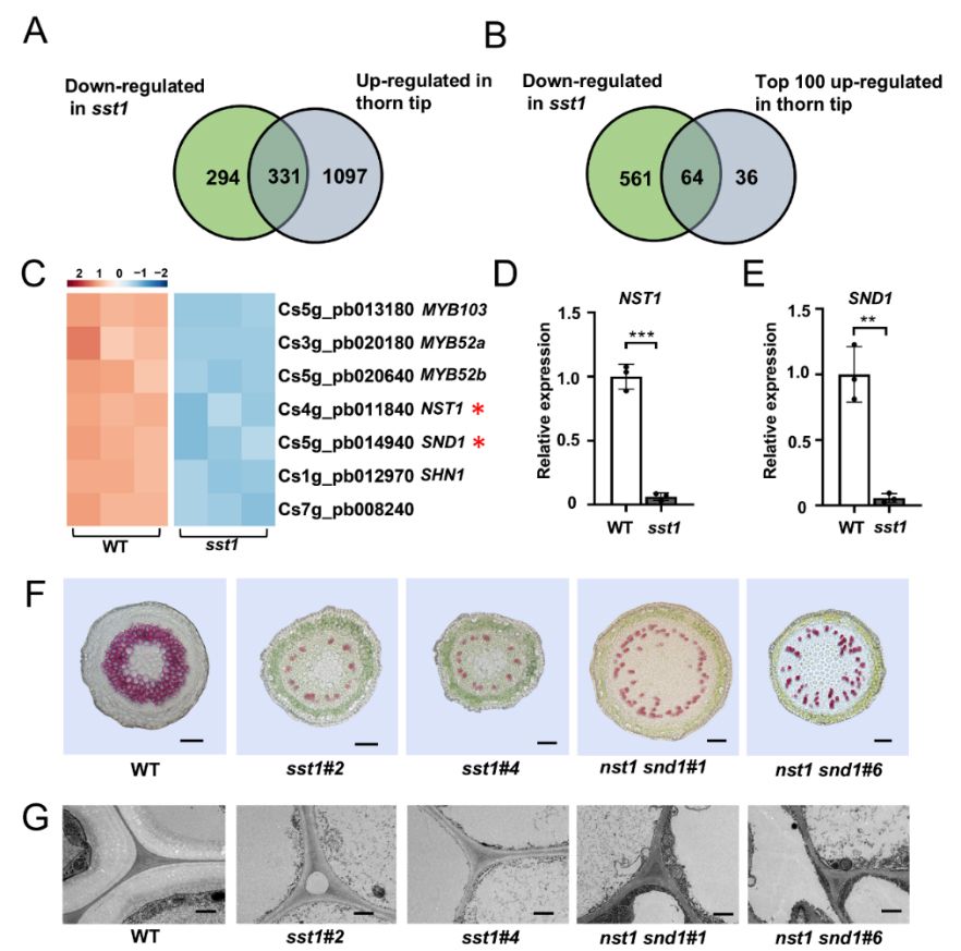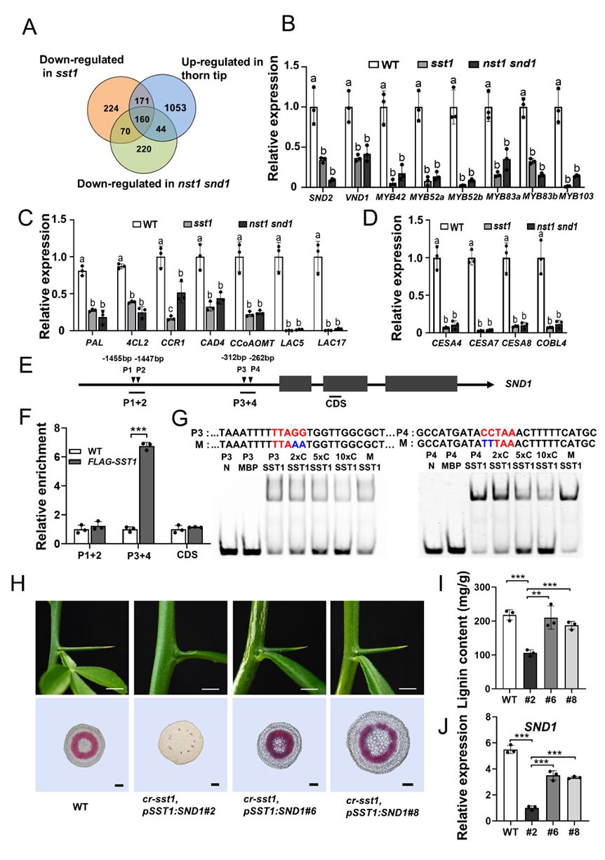 图4. SST1直接激活NST1和SND1,调控枝刺顶部硬化