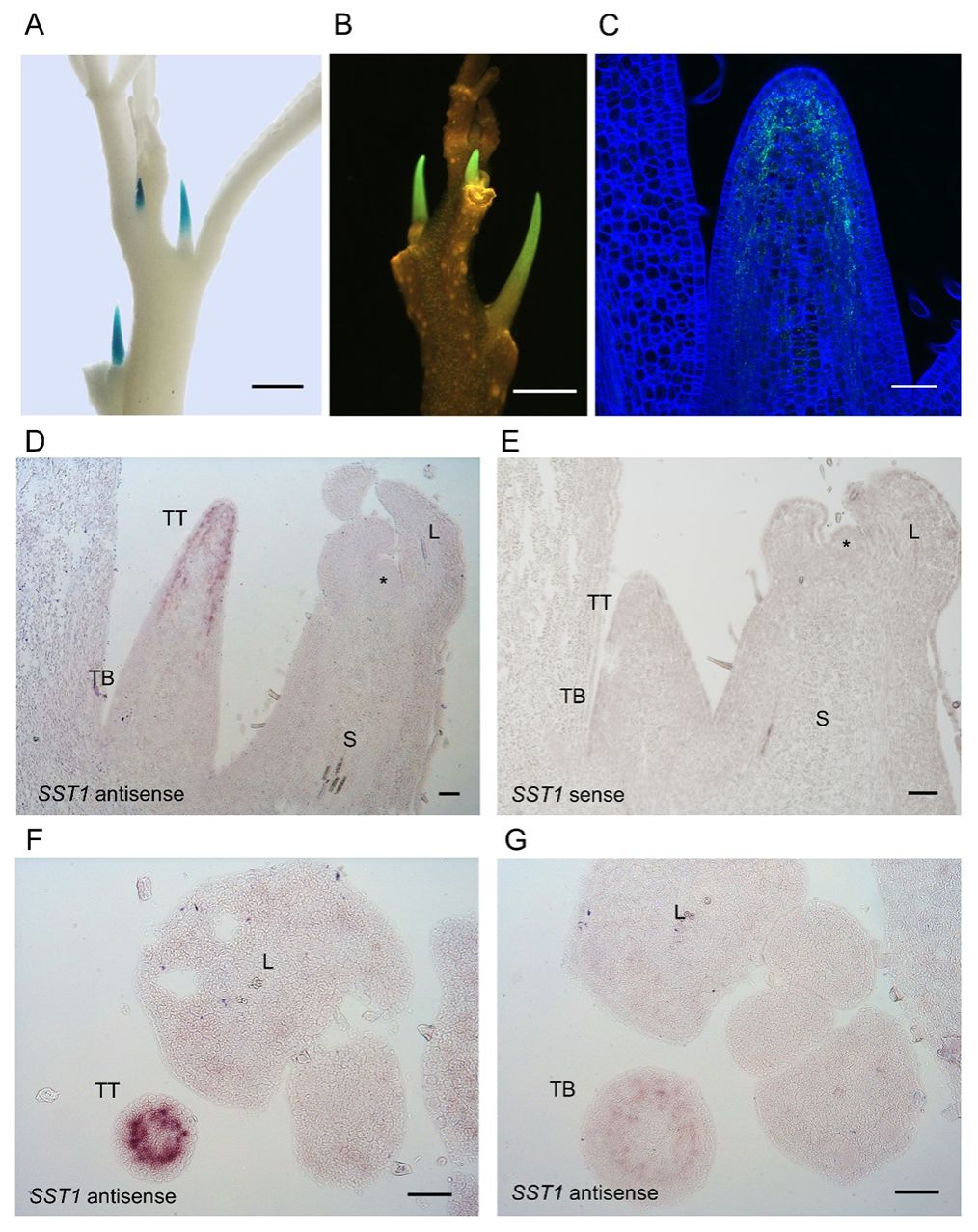 4. SST1同源基因在多个物种的枝刺中保守表达