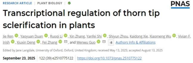 近日,华中农业大学果蔬园艺作物种质创新与利用全国重点实验室/园艺林学学院郭文武教授和张飞教授团队在国际著名学术期刊PNAS在线发表题为“Transcriptional regulation of thorn tip sclerification in plants”的研究论文。该研究以柑橘枝刺为模式系统,首次鉴定植物枝刺顶部硬化核心调控基因SHORT AND SOFT THORN 1(SST1),揭示了SST1-NST1/SND1模块促进次生细胞壁增厚、木质素生物合成的调控机制,发现该分子调控在皂荚、三角梅等多种植物枝刺顶部硬化过程中具有保守性,为植物无枝刺分子育种提供了重要基因资源。