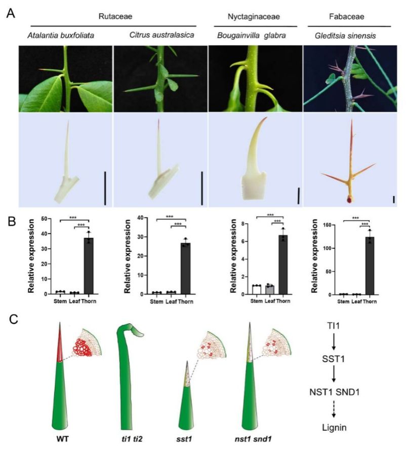 研究还进一步揭示了植物枝刺顶部硬化分子调控机制的进化保守性。鉴定了芸香科的澳指檬、酒饼簕,紫茉莉科的三角梅以及豆科的皂角的SST1同源基因,发现这些植物的SST1同源基因都在枝刺中特异高表达(图5)。