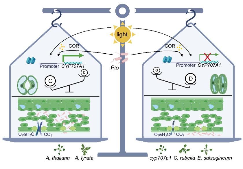 Stomatal opening is crucial for gas exchange, but it unavoidably offers invasion by pathogens. In response, plants close stomata to prevent pathogen entry, while the bacterial pathogen Pseudomonas syringae pv. tomato DC3000 (Pto) produces coronatine (COR), a jasmonate (JA) mimic, to counteract this plant response. Here, we demonstrate that by COR, Pto exploits CYP707A1 activation in Arabidopsis thaliana, encoding an enzyme that degrades abscisic acid, essential for stomatal closure. Notably, COR-induction of CYP707A1 is absent in other Brassicaceae species, such as Capsella rubella and Eutrema salsugineum, rendering them resistant to Pto invasion. In contrast, in A. thaliana, CYP707A1 enables rapid stomatal opening in response to light in a JA-dependent manner, enhancing gas exchange and chlorophyll content, unlike C. rubella and E. salsugineum. Promoter-swap experiments confirm that the regulatory region of CYP707A1 underlies these evolutionary diversifications. Together, our study presents a mechanism underlying an evolutionary trade-off between stomatal defense and gas exchange.