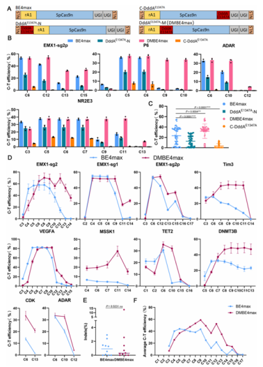 研究团队进一步在动物胚胎、烟草及棉花等不同体系中对 DMCBEs 进行了全面验证,展现出强大的应用潜力:在小鼠和兔胚胎中,DMBE4max对PAM近端位点的编辑效率达 8%-94%,而传统 BE4max在此类位点几乎无编辑活性;在烟草中,DMBE4max对NtPDS 基因的编辑效率最高达 84.78%,较 BE4max 提升 2.4 倍,且成功编辑了此前无法触及的 C1、C13 位点;在棉花愈伤组织中,针对 GhALS 基因的编辑效率提升了0.43-3.23倍,A3A-DMBE4max变体在 C13 位点的编辑效率达到 61.37%。