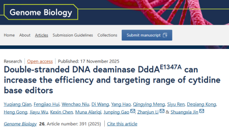 11月17日,我校金双侠教授课题组和吉林大学李占军教授课题组联合在国际知名学术期刊Genome Biology在线发表题为“Double-stranded DNA deaminase DddAᴱ¹³⁴⁷ᴬ can increase the efficiency and targeting range of cytidine base editors”的研究论文,通过融合双链DNA脱氨酶DddAᴱ¹³⁴⁷ᴬ,成功开发出新型高效胞嘧啶碱基编辑器DMCBEs,显著提升了编辑效率与靶向范围,为动植物育种提供了全新工具。