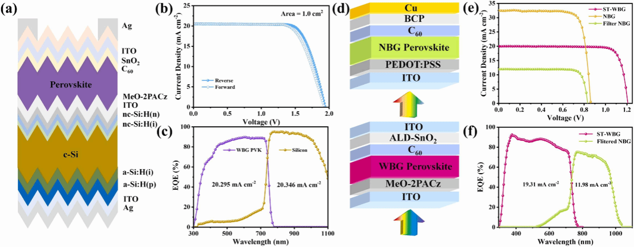 钙钛矿/硅叠层及全钙钛矿叠层光伏器件的结构,光电转换效率及外量子效率图