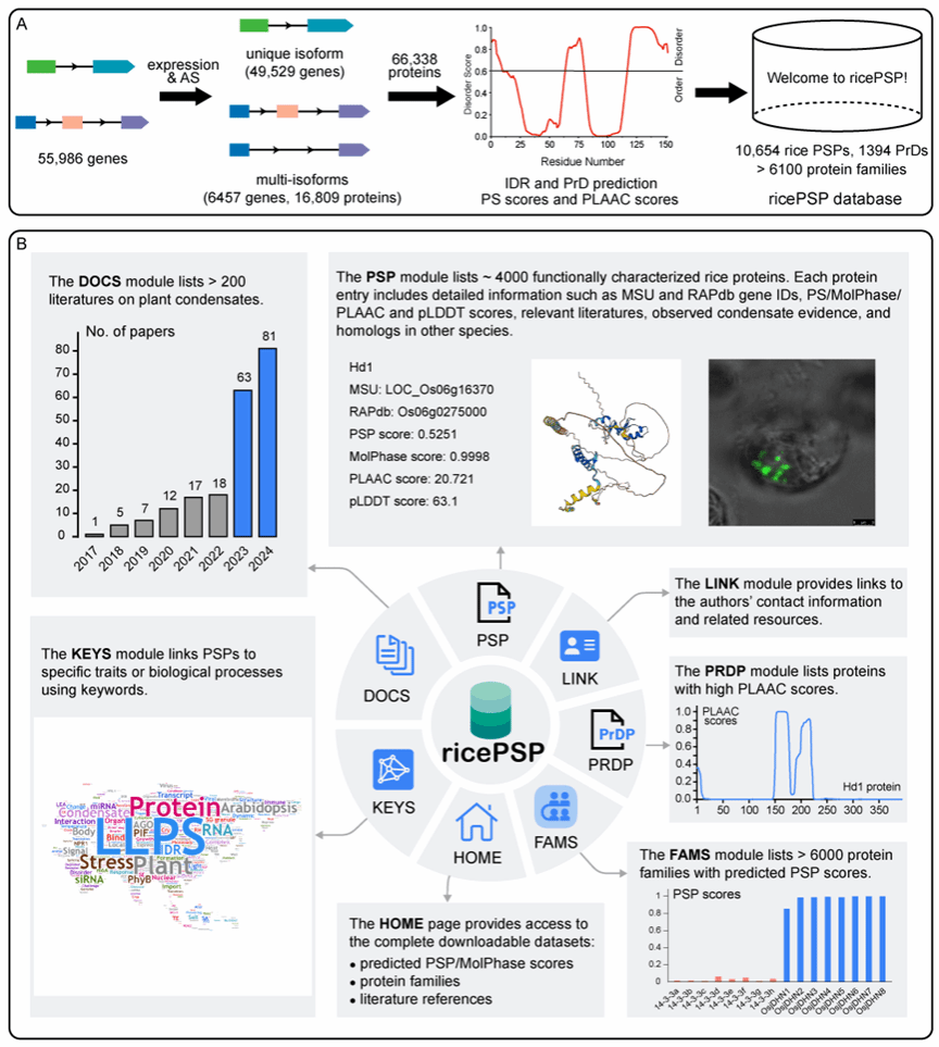 近日,华中农业大学作物遗传改良全国重点实验室李兴旺教授团队构建了水稻相分离相关蛋白的综合数据库ricePSP。该数据库系统整合了水稻全基因组蛋白质的相分离预测评分、结构特征、功能注释及实验验证等信息,为研究作物中无膜细胞器在农艺性状调控中的作用提供了强有力的数据支持。