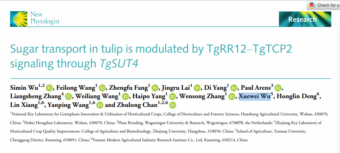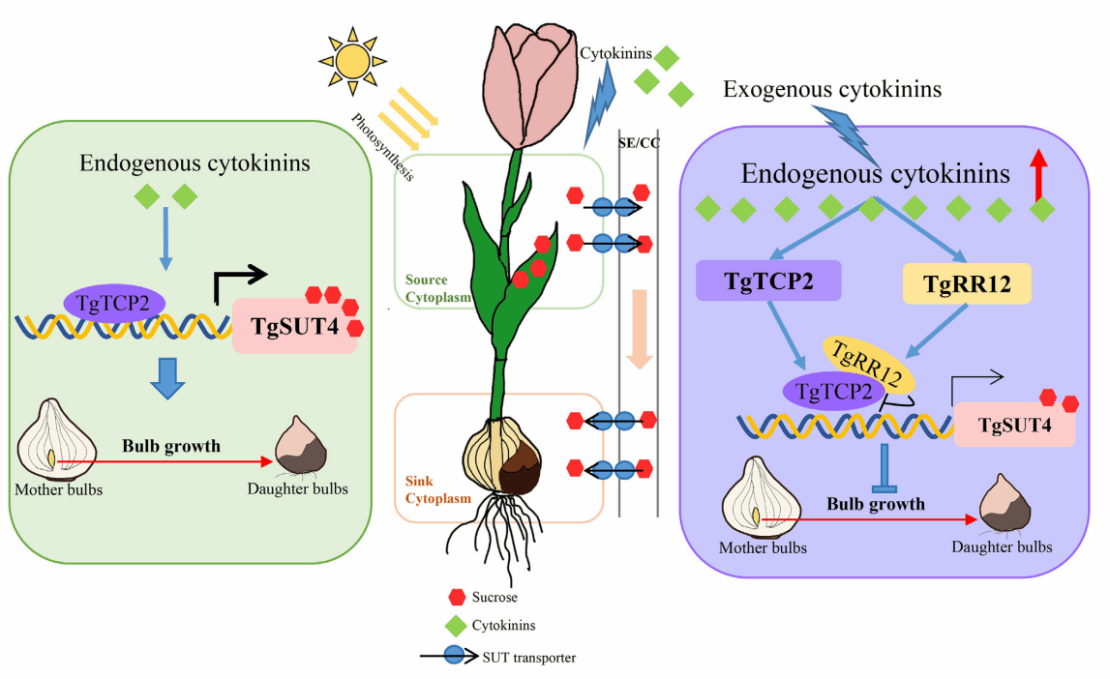 (南湖新闻网讯 通讯员 王艳平 邬思敏)近日,华中农业大学园艺林学学院、果蔬园艺作物种质创新与利用全国重点实验室产祝龙教授课题组在New Phytologist在线发表了题为“Sugar transport in tulip is modulated by TgRR12–TgTCP2 signaling through TgSUT4”的研究论文。该研究揭示了TgTCP2/TgRR12–TgSUT4模块在调节糖运输和郁金香子鳞茎发育中的关键作用,并提供了关于植物激素与初级代谢通路协同作用的新见解。