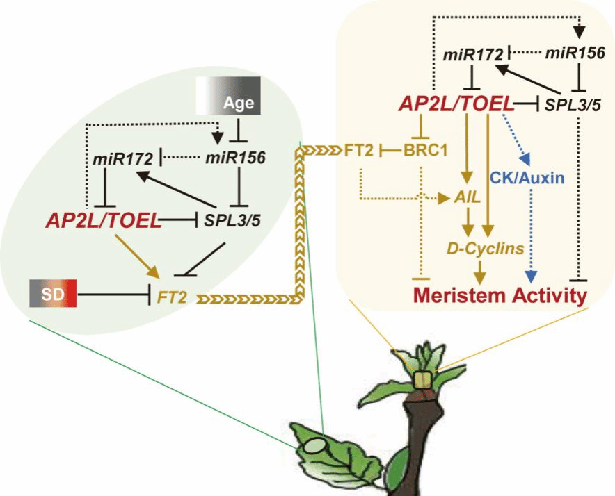 英文摘要:Perennial plants, such as trees native to temperate and boreal regions, exhibit meristems that undergo annual cycles of activity and rest to synchronize their growth cycles with seasonal changes, ensuring survival under harsh winter conditions. The arrest of shoot meristem growth, known as growth cessation, is a critical initial step for trees to enter dormancy. This process is triggered by a combination of endogenous and exogenous signals, yet the molecular mechanisms and signaling pathways underlying growth cessation remain poorly understood. In this study, we demonstrate that Populus orthologs of APETALA2-like transcription factors (AP2Ls), the primary regulators of global proliferative arrest (GPA) in Arabidopsis, play a crucial role in the regulation of seasonal growth cessation in hybrid aspen trees. In particular, AP2Ls act as important activators of the expression of FLOWERING LOCUS T2 (FT2), a key gene for short-day-induced growth cessation. This contrasts with the established role of AP2Ls as repressors of FT in annual plants. Yet, the pathway itself is conserved with the pathway regulating GPA in annual plants, a completely different process during the plant life cycle. Our research highlights both the conserved roles and functional diversities of AP2Ls in a more general balancing of meristem proliferation and arrest in perennial plants, providing insights into the evolutionary adaptation of growth regulation mechanisms across plant species.