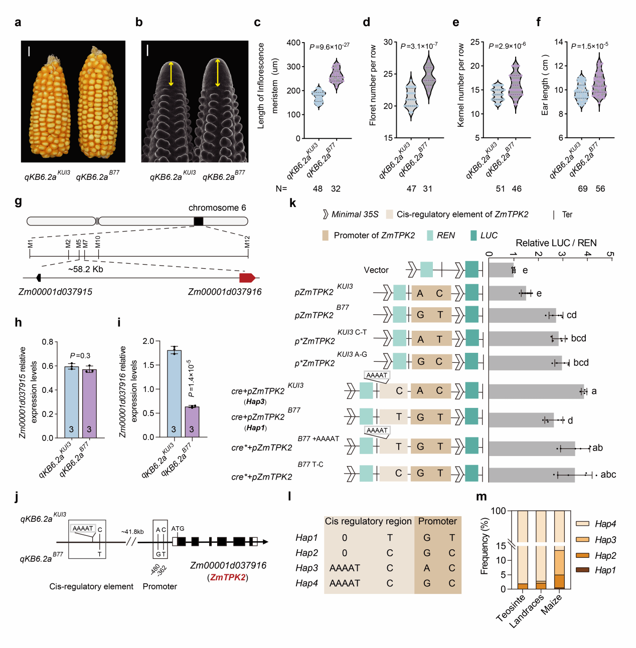 课题组利用玉米短果穗与长果穗品种进行杂交,经过多年研究,最终在玉米的第6号染色体上找到了一个调控玉米果穗长度的关键区域(qKB6.2a),并确定了该区域中的 ZmTPK2 基因就是“幕后主使”。进一步分析发现,ZmTPK2基因的“启动开关”(启动子),与其上游的远端调控元件(cis-regulatory element, CRE)通过远端互作,共同控制这个基因的活跃程度。研究人员发现,不同玉米品种在其“启动开关”和远端调控元件存在细微的DNA序列差异。实验证明,正是这些差异,导致了ZmTPK2基因的表达量不同,进而决定了qKB6.2a穗长的变异,该结果为解析玉米穗长形成机制及挖掘优良自然等位基因提供了重要依据。