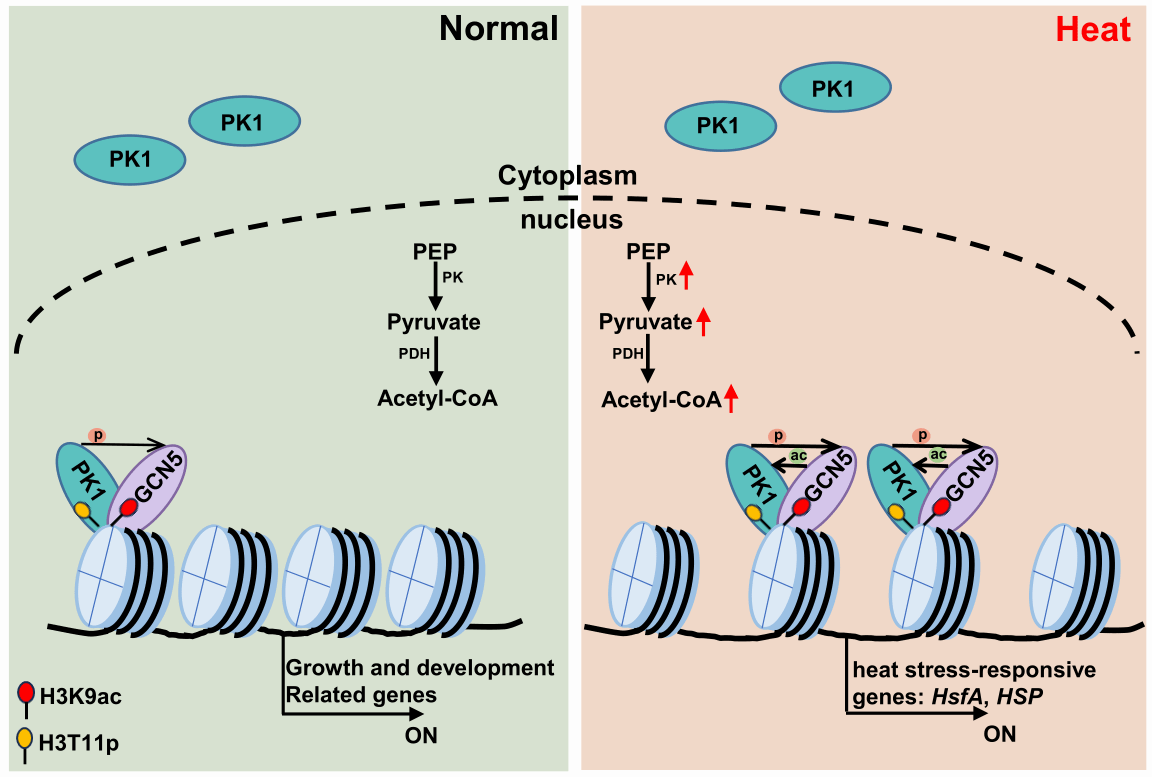 该研究深入探究后发现,水稻中的丙酮酸激酶(PK1)具有整合胁迫信号,参与水稻耐热性的代谢和表观遗传调控的重要功能。PK1在细胞质和细胞核中均有分布,除了在糖酵解中发挥功能外,它还是组蛋白H3苏氨酸T11(H3T11p)的磷酸激酶。结果显示,PK1的过表达能够增强水稻的耐热性,而其功能缺失则会降低水稻从热胁迫中恢复的速度。在热胁迫条件下,PK1的产生、核内富集及其酶活会受到诱导;同时,核内丙酮酸的积累、组蛋白H3T11的磷酸化和H3K9的乙酰化(H3K9ac)水平也会升高,并促进相关基因的表达。进一步研究发现,PK1能够通过对组蛋白乙酰酶GCN5进行磷酸化并激活其活性,从而提高H3K9ac水平。而在热胁迫下,GCN5也会对PK1进行赖氨酸乙酰化,增强PK1对组蛋白H3T11磷酸化和糖酵解中丙酮酸生成的活性。PK1和GCN5调控的H3T11p和H3K9ac是热胁迫响应基因表达所必需的。这些结果充分证实,PK1是连接代谢途径和染色质途径的关键参与者,并揭示了水稻中代谢调节因子和染色质调节因子之间相互刺激、共同增强水稻抗逆性的机制。