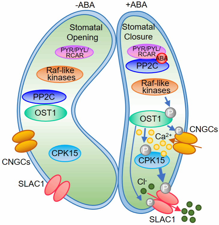 该研究更新了ABA诱导气孔关闭的模型:ABA激活后的OST1发挥多重功能:它可以通过磷酸化 CNGC提高细胞质中的Ca2+水平;还可以直接磷酸化CPK15。升高的 Ca2+进一步增强CPK15的激酶活性,从而有效促进其对SLAC1进行磷酸化并激活。此外,OST1还可以通过不依赖Ca2+的途径直接磷酸化SLAC1。这些调控机制确保了植物在干旱等逆境条件下气孔能够迅速闭合减少水分散失。