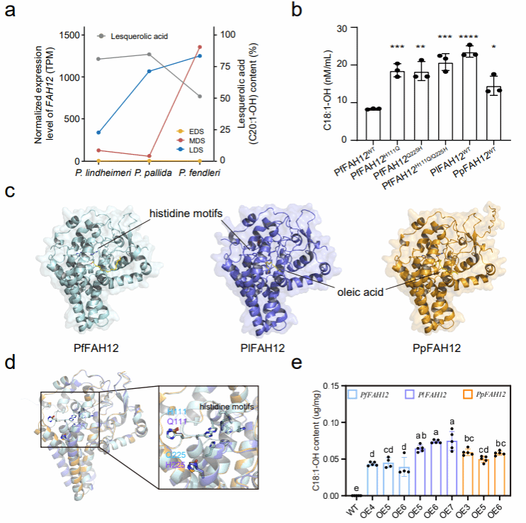 P. lindheimeri、P. pallida和P. fendleri的种子中,HFA(C20:1-OH)的含量占它们对应总脂肪酸含量的80.78%、84.56%和51.19%。这种HFA含量的差异为解析Physaria属物种积累HFA的机制提供了宝贵的种质资源。为了阐明三种Physaria属植物油脂生物合成和HFA积累的遗传机制,本研究比较了不同发育阶段(种子发育早期、中期和后期)的种子、叶片和茎的转录组。分析发现在脂质合成基因如FAH12、KCS3、LPAT和DGAT等在Physaria种子高表达,推测这些基因可能是HFA大量积累的主要原因。通过基因表达分析、同源序列比对、蛋白质结构预测、底物的分子对接以及酶活性验证,证明FAH12介导的C18:1羟基化生成C18:1-OH是决定C20:1-OH含量差异的关键步骤,并鉴定出影响FAH12活性的关键氨基酸位点Q111和H225,揭示了FAH12调控HFA合成的分子机理(图2)。该研究不仅丰富了Physaria植物HFA代谢的理论基础,更为作物中HFA的定向改良提供了重要的科学依据与基因资源。