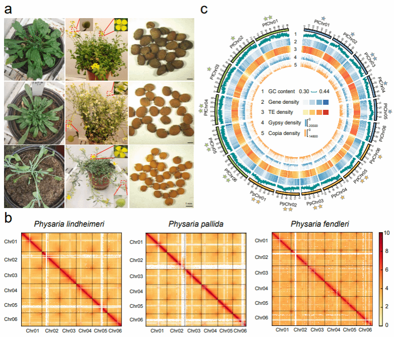 该研究利用PacBio测序技术和Hi-C技术,完成了三种代表性Physaria属物种(P. lindheimeri、P. pallida和P. fendleri)的染色体水平的基因组组装(图1)。通过对基因组的演化分析,发现Physaria属与拟南芥的分化发生在15.11亿年前。此外,在14.10~14.46亿年前,Physaria属不仅经历了芸苔科物种共有的α和β全基因组加倍事件,还经历了两个连续的物种特异性全基因组加倍事件。这些频繁的全基因组重复事件极大地促进了十字花科物种的多样性。基于高质量的参考基因组,还发现Physaria属的着丝粒区域存在高度保守的111 bp卫星重复序列,且富集Gypsy/CRM和Copia/Al两类逆转录转座子。此外,在Physaria属基因组中还发现了大量串联重复基因,功能富集分析表明,这些基因可能在维持物种生物稳态、适应环境中发挥重要作用。