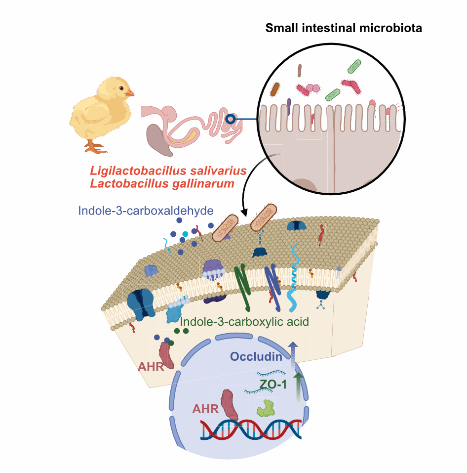 南湖新闻网讯(通讯员 黄宇轩)近日,我校农业微生物资源发掘与利用全国重点实验室、教育部动物育种与健康养殖前沿科学中心、湖北洪山实验室、动物科学技术学院动物医学院孙铝辉教授团队以“Gut microbiome-derived indole-3-carboxaldehyde promotes intestinal development via AHR-NRF2 signaling in the early-life of chicks”为题在Microbiome期刊上发表最新研究成果。该研究以肉雏鸡为研究对象,发掘出功能微生物菌株母鸡乳杆菌C2-16-2和唾液联合乳杆菌D7-21,并阐明其通过代谢色氨酸产生吲哚甲醛代谢物促进鸡肠道屏障功能和提高抗氧化能力的作用机制,在实施肠道菌群和代谢物干预改善肉雏鸡肠道健康方面具有重要意义。