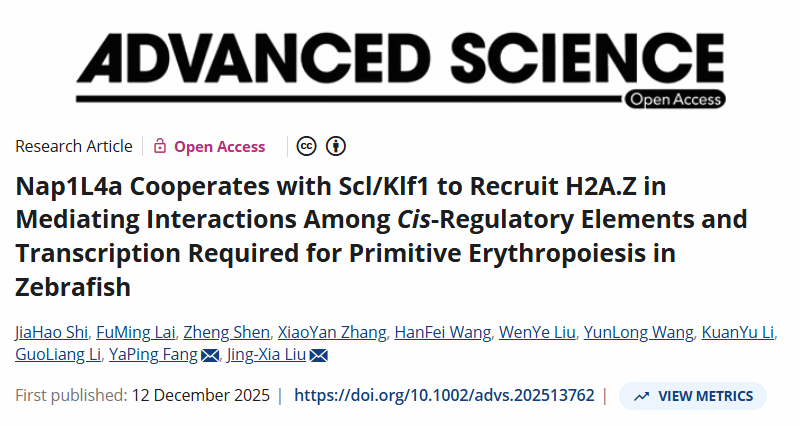 近日,我校水产学院刘静霞教授领衔的鱼类逆境发育生物学团队联合信息学院方亚平副教授和李国亮教授在国际学术期刊 Advanced Science 发表了题为“Nap1L4a Cooperates with Scl/Klf1 to Recruit H2A.Z in Mediating Interactions Among Cis-Regulatory Elements and Transcription Required for Primitive Erythropoiesis in Zebrafish”的研究论文。该研究通过整合斑马鱼突变体表型分析与CUT&Tag、ATAC-Seq及RNA-Seq等大规模多组学数据,从表观遗传修饰与转录调控互作的角度,系统解析了核小体组装蛋白Nap1L4a在红细胞发育中的功能网络,构建并阐述了“Nap1L4a-Scl/Klf1-H2A.Z”这一全新的表观遗传调控复合物模型,深入揭示了核小体组装蛋白Nap1L4a在重塑染色质景观调控、驱动红系基因表达及响应低氧胁迫中的核心作用,为解析人类血液疾病发病机理及鱼类抗低氧等性状形成的遗传基础提供了全新理论基础。