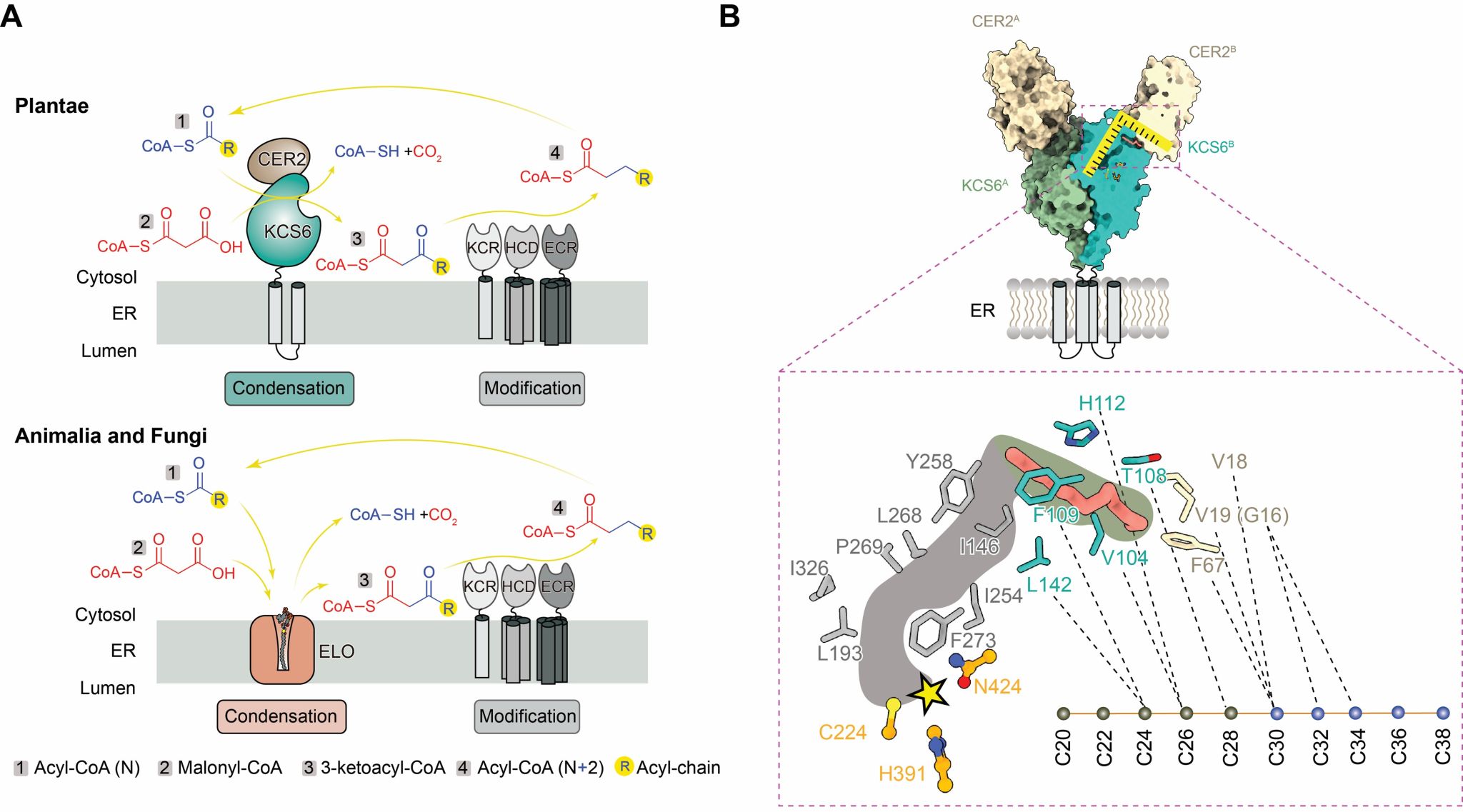 在真核生物中,VLCFAs的合成由内质网中的一系列酶催化完成,其中负责第1步反应的延伸酶决定合成VLCFAs的碳链长度。与动物和真菌中的延伸酶(ELOs)不同,植物通过β-酮酰辅酶A合酶(KCSs)和ECERIFERUM2(CER2)家族成员协同催化不同碳链长度VLCFAs的延伸(图1A)。尽管近年来在多种植物中陆续鉴定出一系列KCS和CER2家族成员,参与VLCFAs的延伸功能,但这两个家族如何协同控制不同碳链长度VLCFAs延伸的结构基础与生化机制仍不清楚,阻碍了对植物VLCFAs合成的靶向改良及其工业化应用。