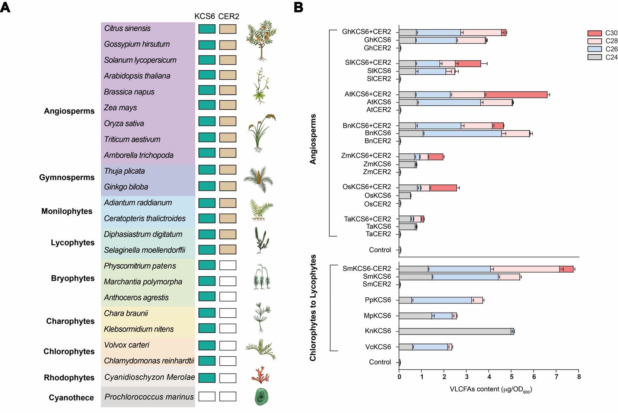 本研究以具有重要经济价值的园艺果树——柑橘为例,通过KCS家族及CER2家族的全基因组鉴定与酵母表达体系的功能验证,挖掘出了控制VLCFAs延伸的关键酶复合物KCS6-CER2,负责C24-C30 VLCFAs的延伸。基于KCS6-CER2复合物的结构分析,鉴定到了该复合物中延伸VLCFAs所需的底物结合区域——催化腔。其中,KCS6作为核心酶,提供延伸反应的活性中心以及催化腔的主体;CER2则作为辅因子,附在KCS6胞质侧的侧面,提供疏水“盖子”,进而拓展了KCS6的催化腔,使其能够容纳更长的VLCFAs底物(≥C28)。通过对催化腔中的关键氨基酸进行点突变,评估了各氨基酸控制延伸不同碳链长度VLCFAs的贡献,表明其催化腔的疏水性及体积共同决定了最终合成VLCFAs的碳链长度(图1B)。此外,系统发育进化树和功能验证实验表明,KCS6-CER2复合物起源于陆生维管植物且其延伸机制在物种间高度保守(图2)。