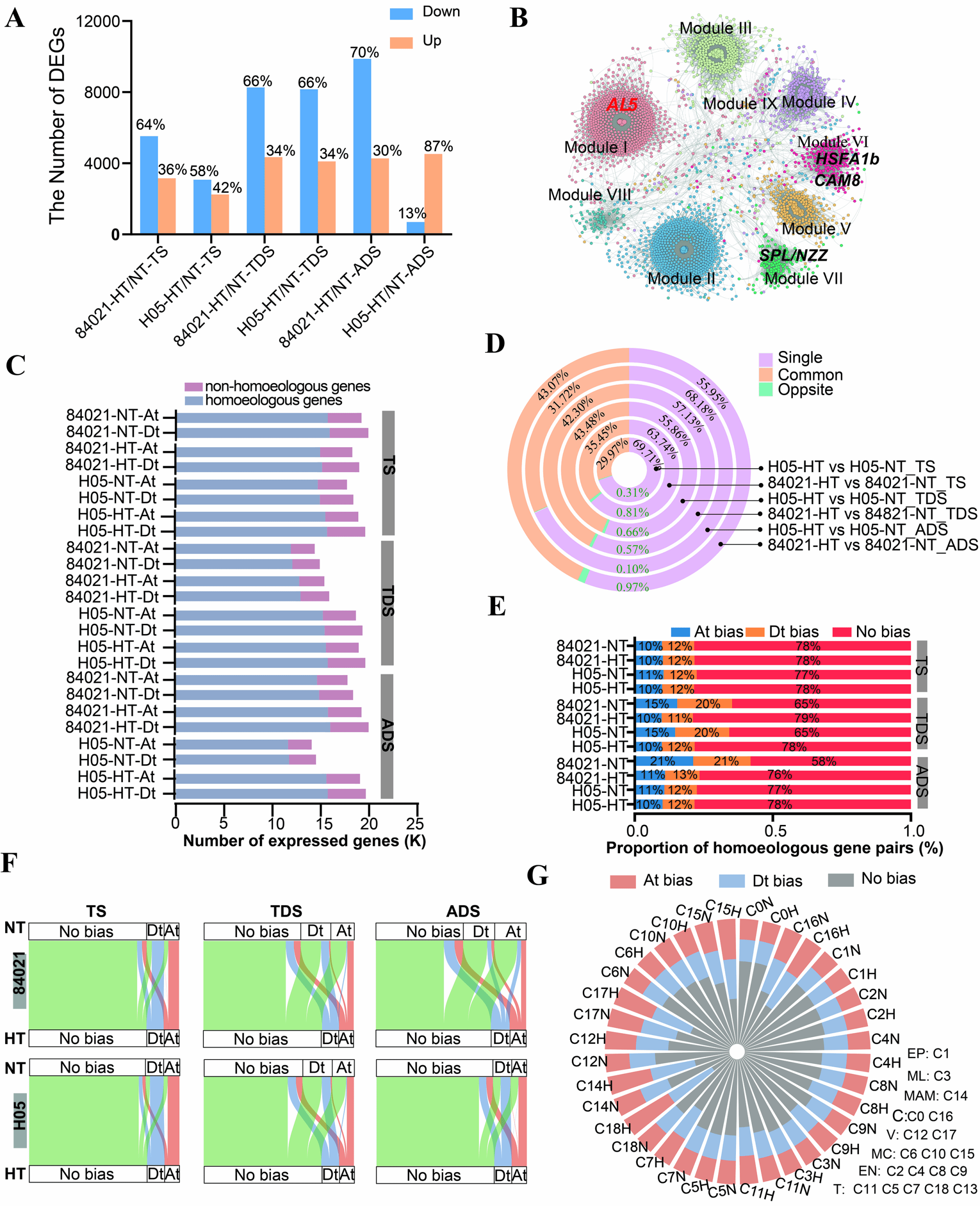 首先,本研究以极端耐热品系“84021”和高温敏感品系“H05”为材料,在花药发育的三个关键时期(四分体期、绒毡层降解期、花药开裂期)获得了系统的RNA-seq、原位Hi-C、ATAC-seq和ChIP-seq数据。转录组分析发现,高温下敏感材料“H05”表现出更剧烈的转录激活,尤其是上调基因比例显著高于耐热材料。通过共表达网络分析鉴定到多个与热胁迫响应的核心模块。作为异源四倍体,棉花的At和Dt亚基因组间存在广泛的同源基因。研究发现,耐热材料“84021”在高温胁迫下,更多同源基因对倾向于从“偏向表达”转变为“平衡表达”,在敏热材料“H05”中相反;在单细胞水平也发现同样现象,在高温敏感的绒毡层和小孢子等细胞类型中表达偏倚严重,而相对耐热的表皮细胞等亚基因组表达相对平衡 (图1),说明亚基因组表达平衡与细胞耐热性密切相关。