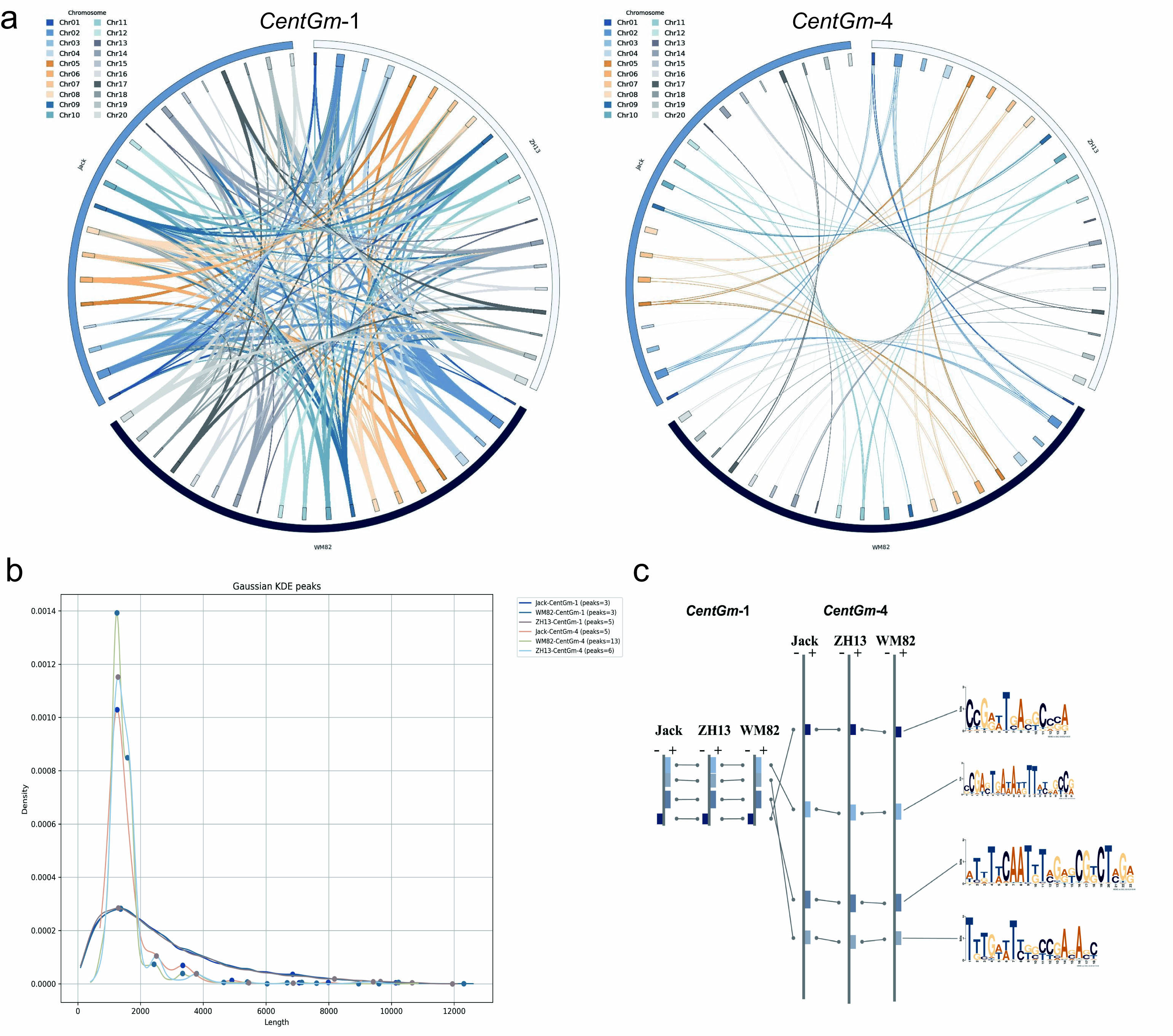 We conclude that CentGm-1 and CentGm-4 evolve independently. The observation that completely identical CentGm-4 sequences consistently appear on the same chromosome across different soybean varieties indicates a stronger chromosome-specific preference for CentGm-4. We propose a model in which replication templates within the centromere region originate from multiple CENH3-nucleosome complexes bound to CentGm sequences. Both CentGm-1 and CentGm-4 contain similar motifs with the potential to bind CENH3 protein. The findings provide a new insight into the mechanisms behind centromere diversity and dynamics.