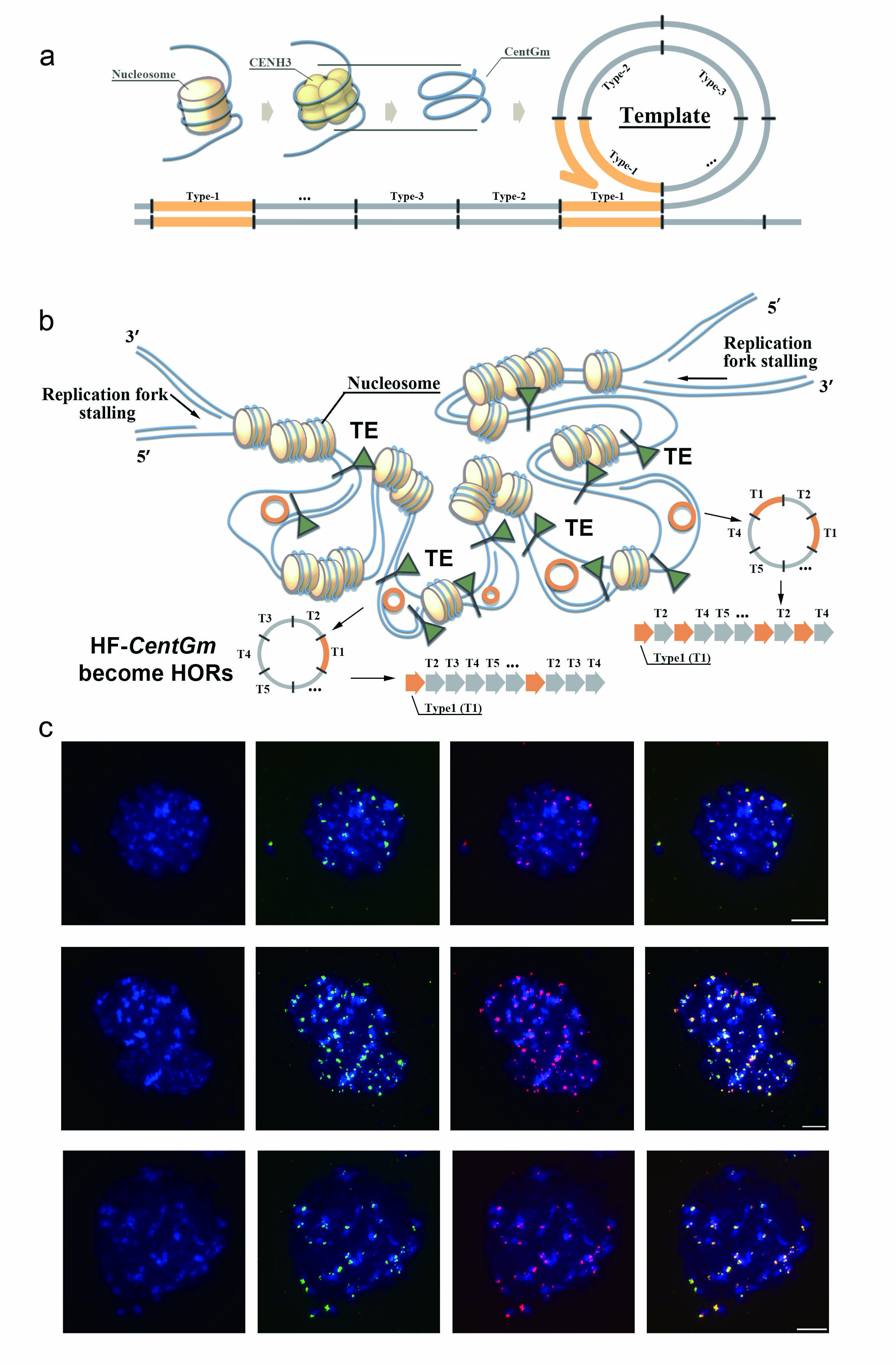 着丝粒是动粒形成的基础结构,动粒通过与纺锤体微管结合,确保染色体在细胞分裂过程中被精确分离。尽管着丝粒在功能上高度保守,但其DNA序列却表现出显著的快速演化和高度多样性,这一现象被称为“着丝粒悖论”。在多数真核生物中,着丝粒区域富集大量卫星重复序列,但这些重复序列与着丝粒特异性组蛋白CENH3(动物中对应CENP-A)之间的功能关系仍不清楚。此前研究表明,大豆着丝粒主要由两类串联卫星重复序列构成:CentGm-1(约91 bp)和CentGm-4(约410 bp)。不同类型串联重复序列如何形成、是否承担不同功能,以及在快速演化过程中如何维持着丝粒稳定性,成为亟待解答的科学问题。